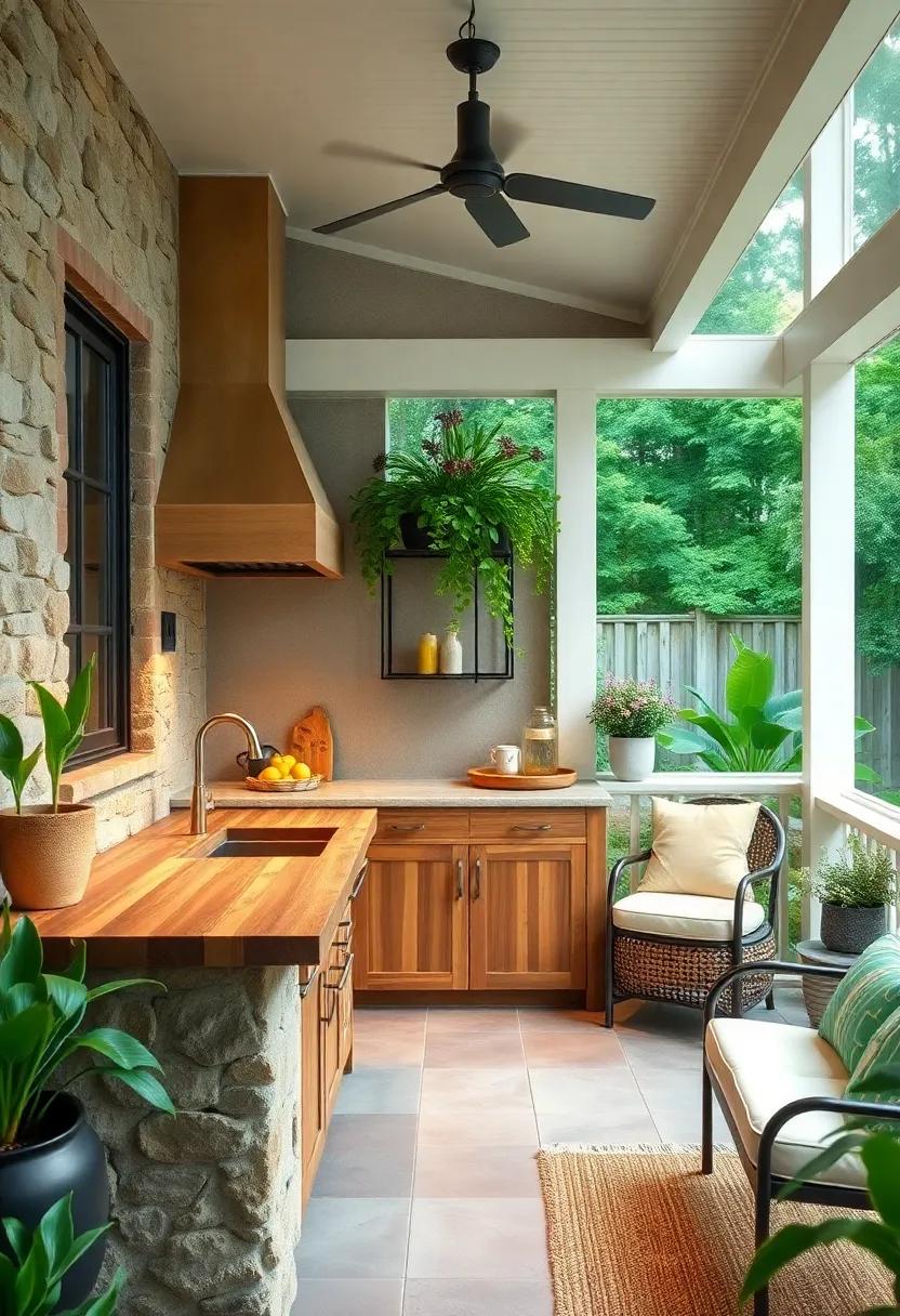 Create a zen oasis on your screened porch with a tranquil kitchen that integrates natural wood countertops and a stone sink, encouraging relaxation and mindfulness while cooking outdoors