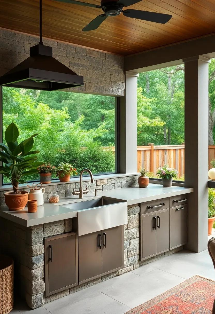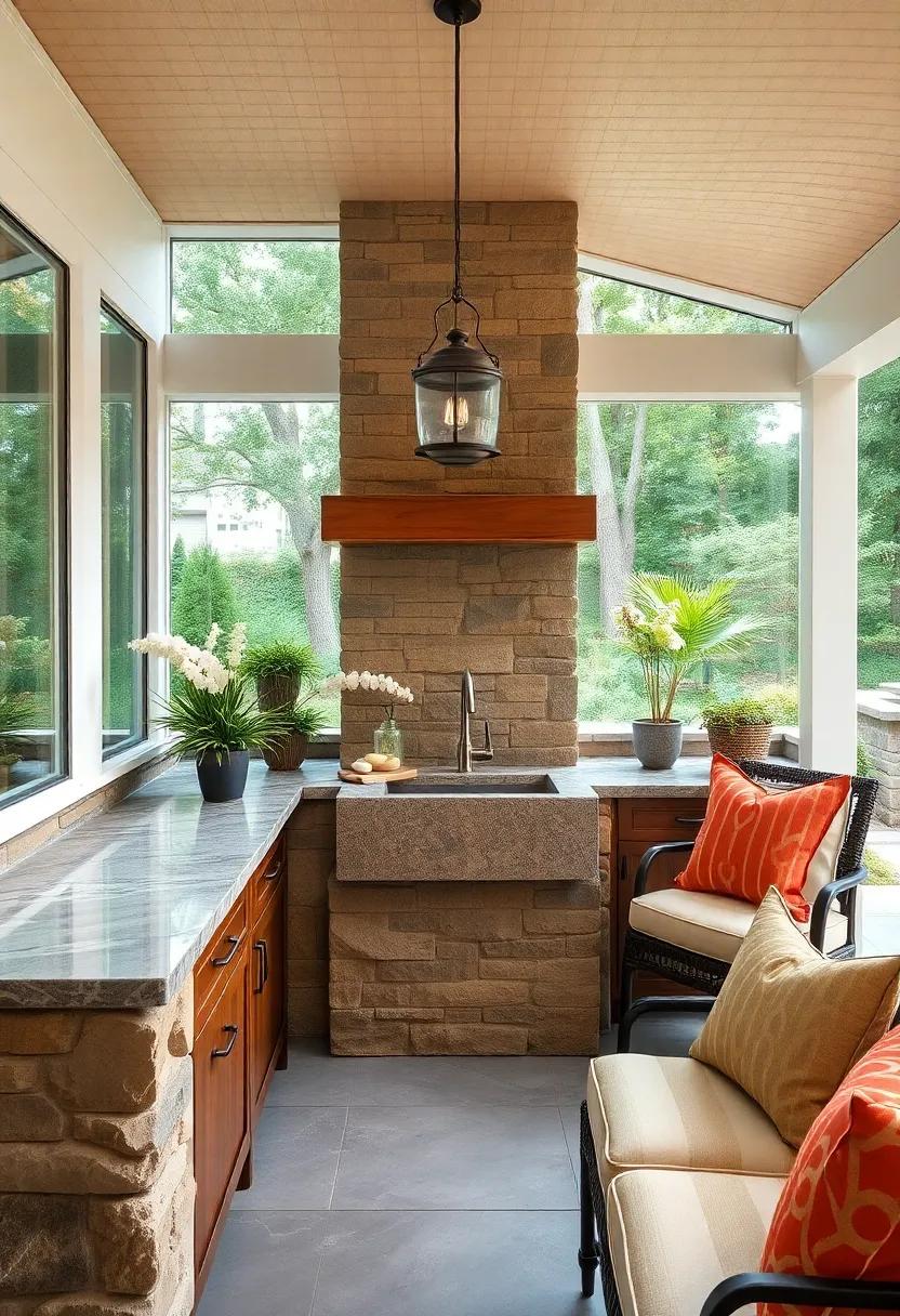 Celebrate the outdoors with a nature-inspired screened porch kitchen where a natural stone sink echoes the surrounding landscape, creating a peaceful ambiance for all your culinary endeavors