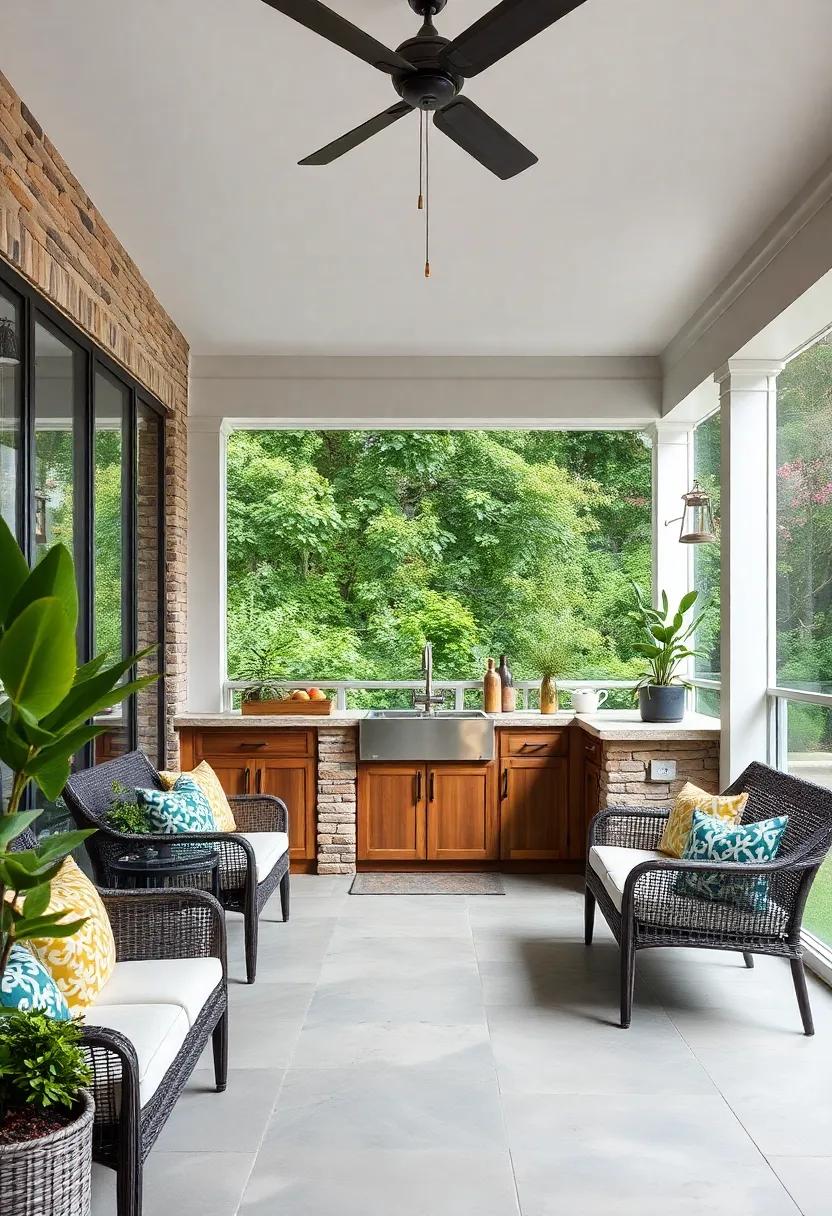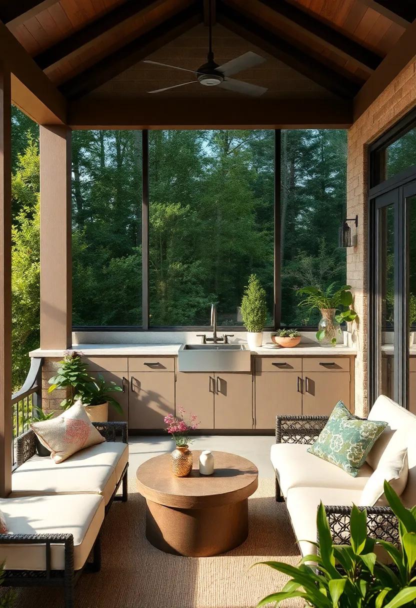 Marry sophistication and comfort with a stylish porch kitchen that includes a sleek sink surrounded by plush seating, creating a perfect blend of function and relaxation