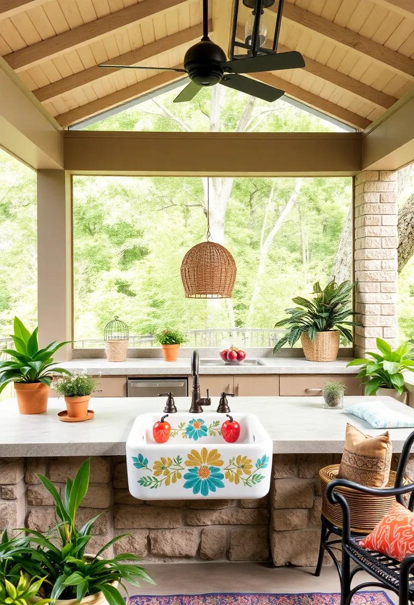 Discover the charm of a bohemian styled space, where a unique, hand-painted sink and eclectic décor create a fun, vibrant atmosphere perfect for creative cooking sessions