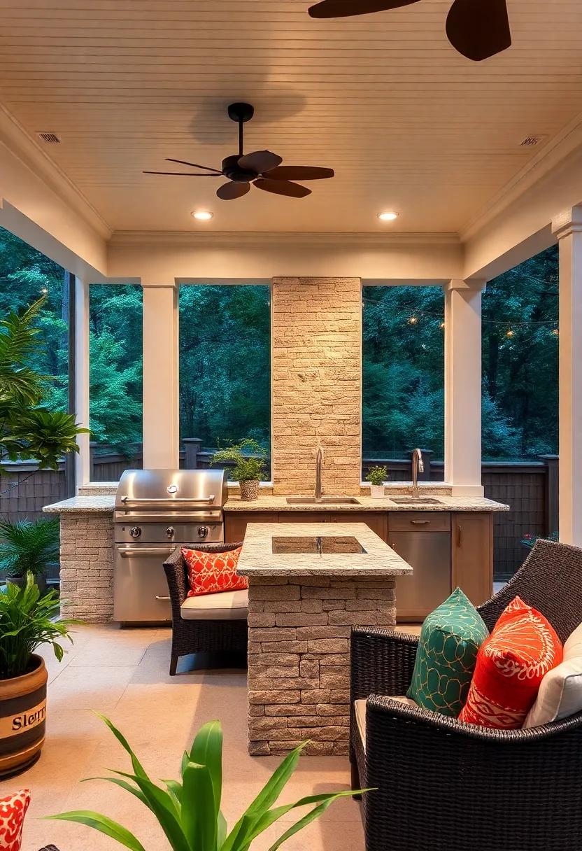 In this gorgeous setup, consider incorporating unique elements to elevate the overall aesthetic. A neatly designed island bar can serve as an additional prep space, while clever storage solutions keep utensils and serving ware within reach. The fusion of style and practicality doesn’t stop there; think about decorative lighting fixtures that add a touch of glamour in the evenings, enhancing the ambiance under the stars. With the right design choices, your porch kitchen evolves into not just a cooking space, but a captivating retreat that redefines outdoor living.
