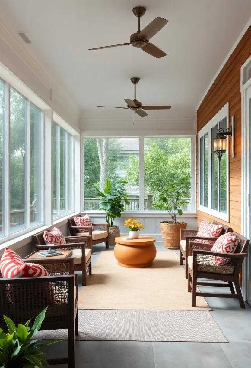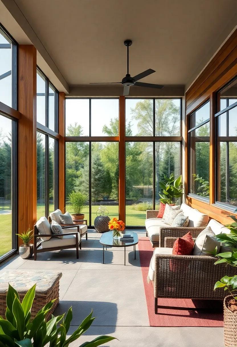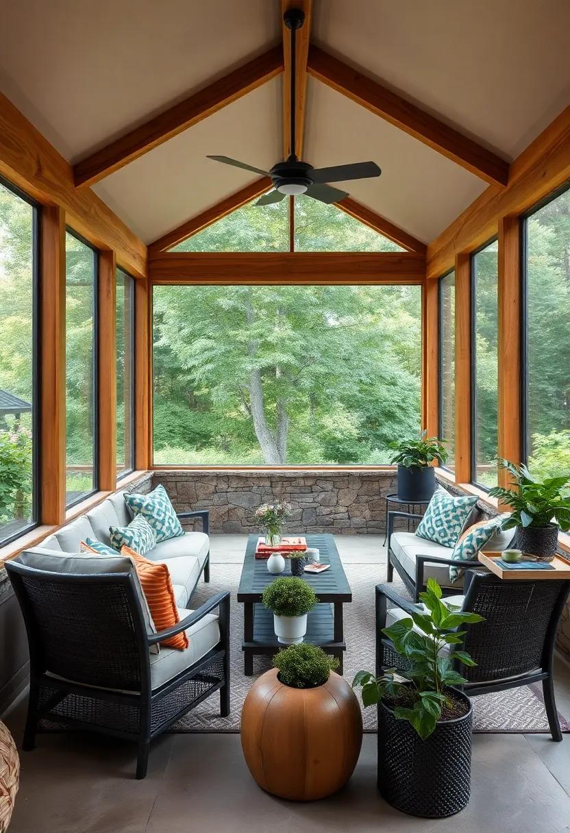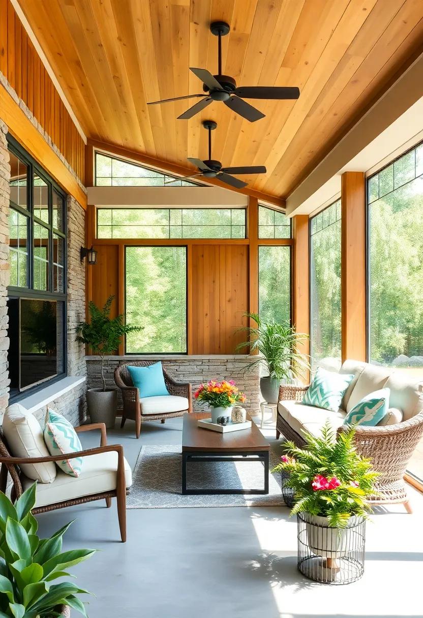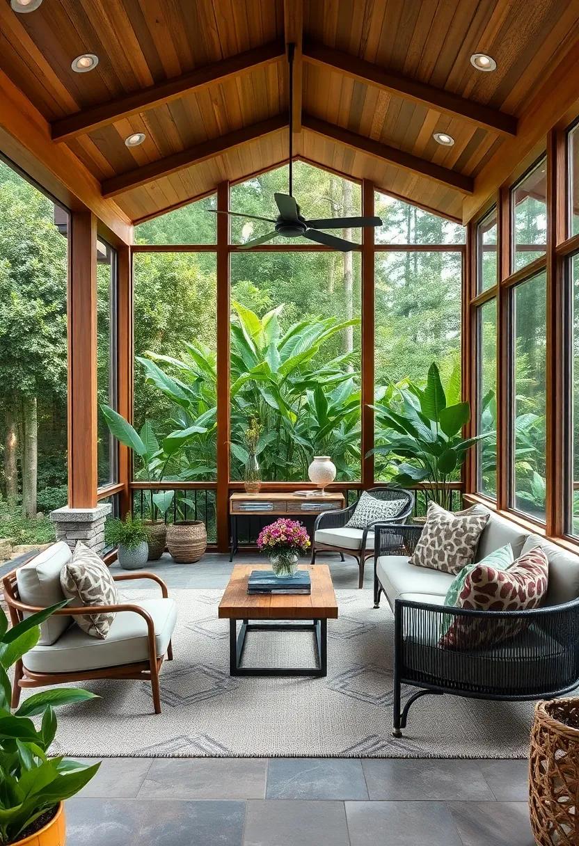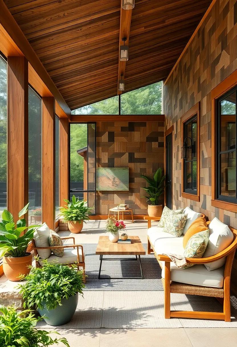 Imagine sipping your morning coffee in a tranquil, eco-conscious retreat that seamlessly blends style and sustainability. This screened porch exemplifies modern design principles by showcasing materials like bamboo and reclaimed woods, which are not only durable but also add a unique character that mass-produced items can’t replicate. The warm tones of the wood combined with the sleek lines of bamboo create an inviting atmosphere, while the careful selection of materials minimizes environmental impact. The use of natural elements brings the outdoors inside, fostering a connection with nature without compromising on aesthetics.