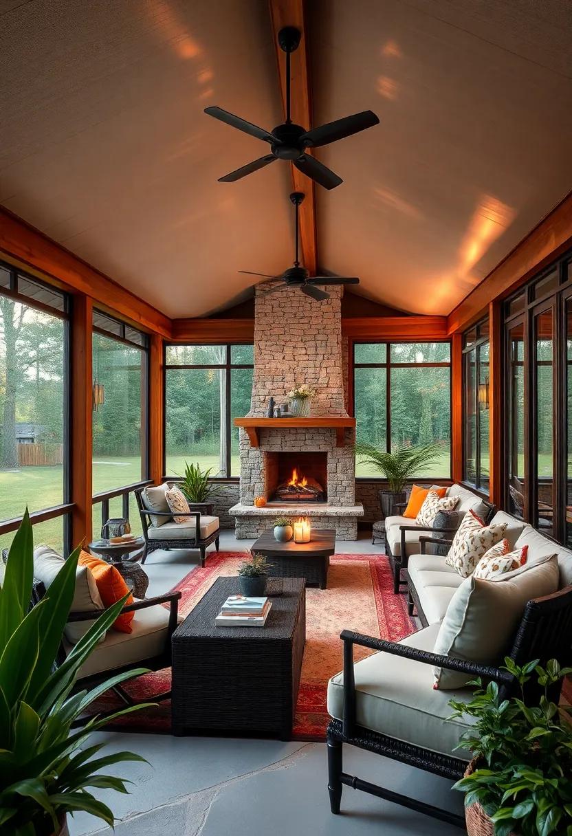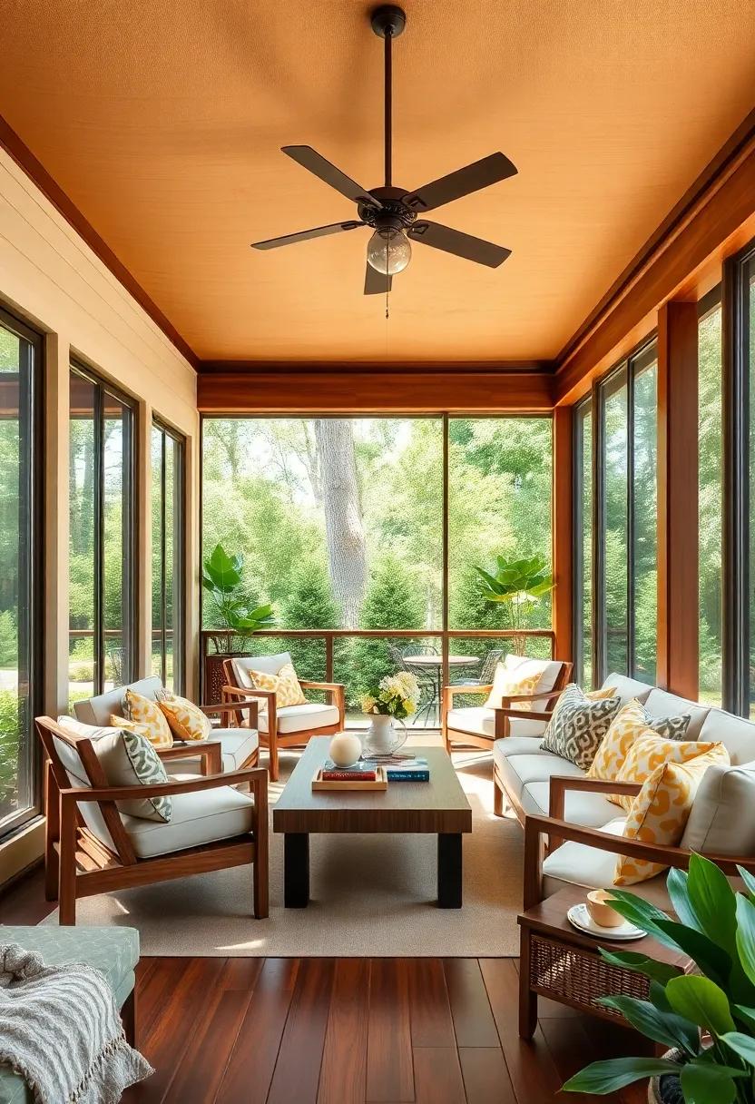 The color palette within this space plays a vital role in cultivating an ambiance of tranquility. Soft, earthy tones dominate, while the textures of the wood add depth and warmth. Thoughtfully placed greenery adds a splash of color and life, enhancing the connection between interior and exterior spaces. The layout is designed for both relaxation and socialization,offering a perfect balance of intimate nooks and open areas where families can gather.Altogether, this screened porch is a masterclass in design, demonstrating how wood accents can transform an ordinary area into an extraordinary haven.