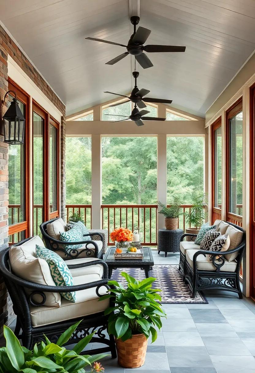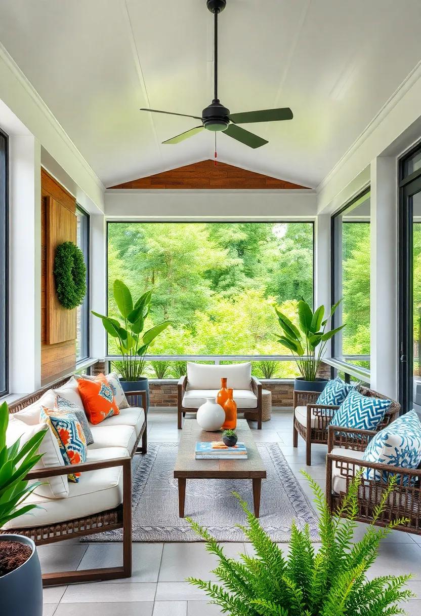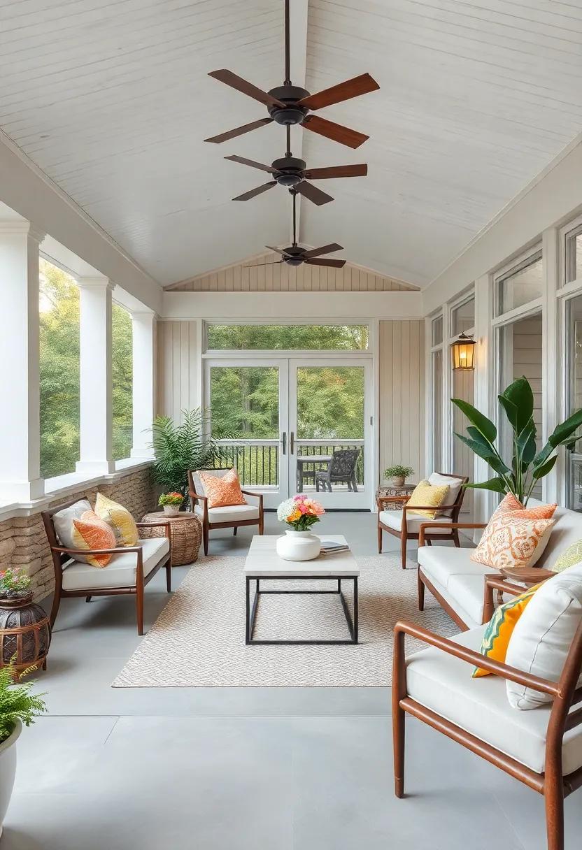 Incorporating functionality into this serene space,the design also seamlessly blends indoor and outdoor living.Smartly placed ceiling fans cool the area during warm days without overshadowing the minimalist aesthetic. Additionally, seating is kept simple yet stylish, featuring low-profile furniture that encourages casual gatherings and leisurely afternoons. The attention to detail in layout allows for natural movement through the space,showcasing how a minimally designed porch can redefine outdoor lifestyle choices. Consider these essential aspects: