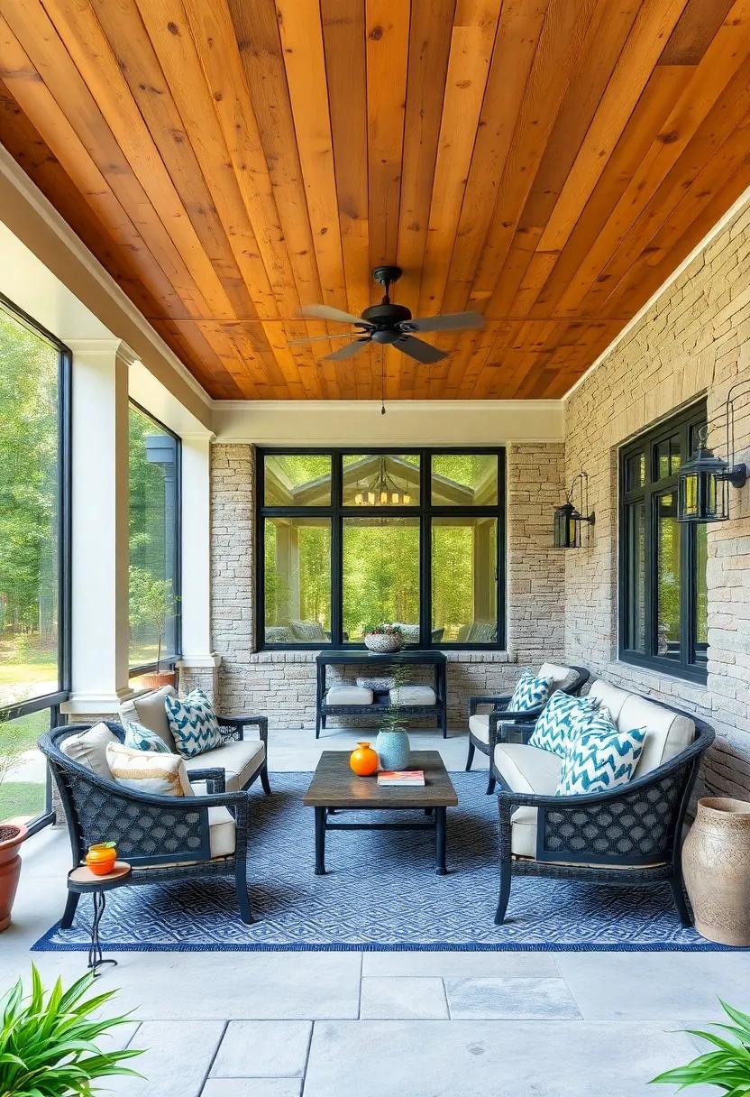 A porch that elegantly marries cedar wood ceilings with stone walls offers a stunning visual appeal,turning an ordinary outdoor area into a delightful escape. The natural warmth of the cedar brings a soothing ambiance that contrasts beautifully with the rugged stone,resulting in a dynamic aesthetic that captivates the senses. This combination not only defines the architectural elements of the space but also encourages a seamless flow between indoor comfort and outdoor nature, inviting you to relax with a refreshing beverage while bathing in the natural light.