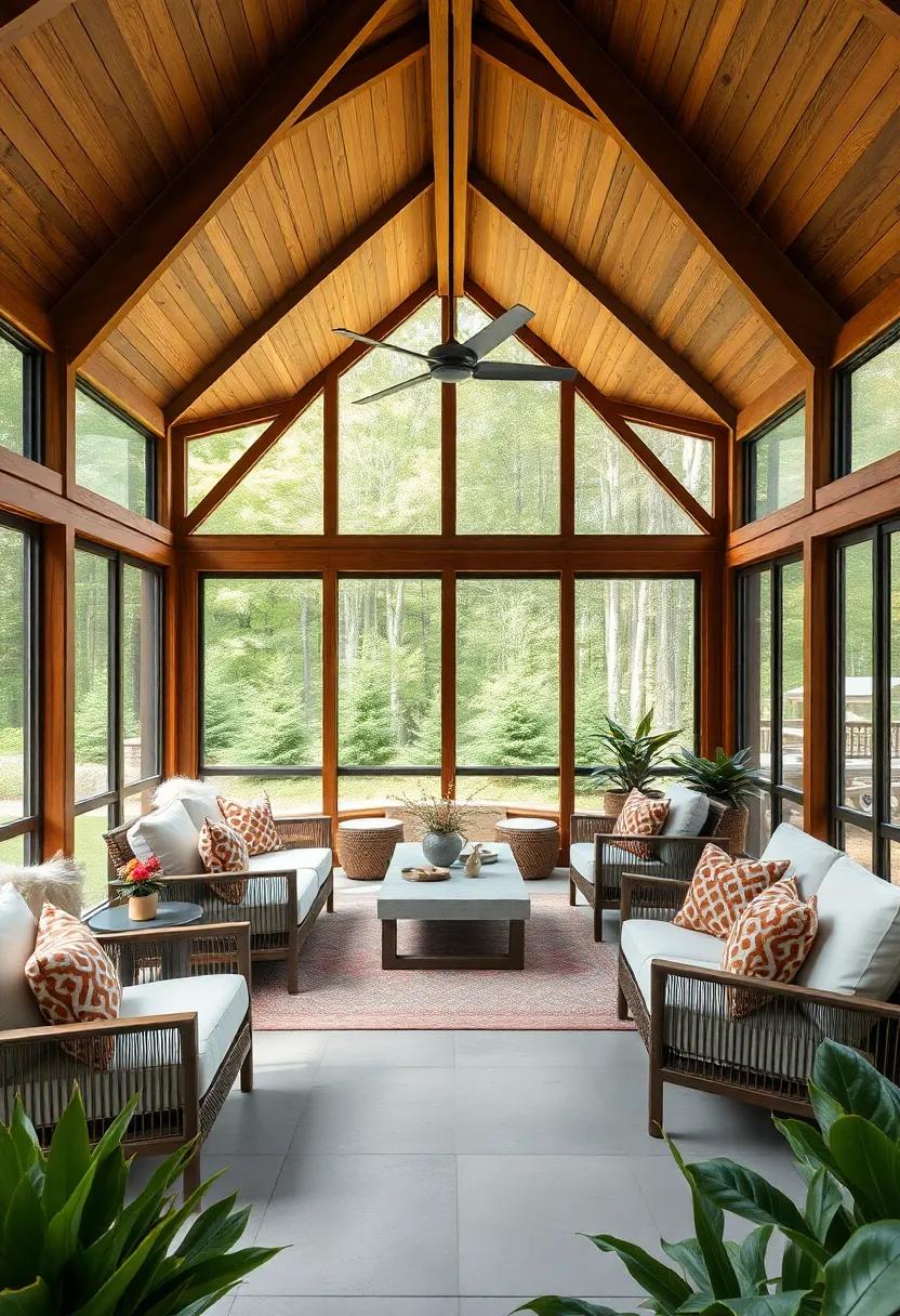 Enhancements like soft lighting embedded in the ceiling structure elevate the ambiance, transitioning the vibe from day to evening with ease.Complementing the inviting seating are decorative elements such as natural wood coffee tables and potted greenery, creating an inviting environment that truly reflects a serene outdoor oasis.Each aspect, from the intricate ceiling to the thoughtful decor, outlines a harmonious blend of comfort and aesthetic appeal, transforming this screened porch into a retreat where relaxation and connection flourish.