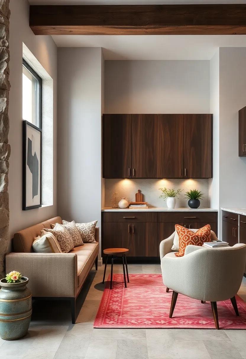 To enhance this cohesive design, consider incorporating motifs and colors that reflect the deep hues of your cabinetry throughout the shared spaces. Some effective strategies include: