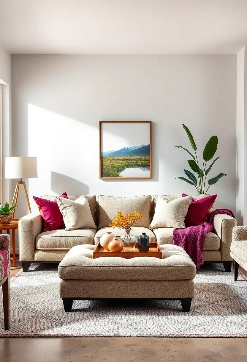 Using oversized throw pillows on a low ottoman can transform your small living room into a cozy, multifunctional space. These plush accessories not only provide extra seating but also enhance the overall aesthetic of your room, adding a pop of color and texture. Imagine your ottoman serving as a central gathering space, surrounded by friends or family, where everyone can comfortably lounge while enjoying a cup of coffee or a game night. Positioning the oversized pillows on the ottoman gives you a stylish way to encourage casual sitting without needing bulky chairs, making your living space feel expansive yet intimate.