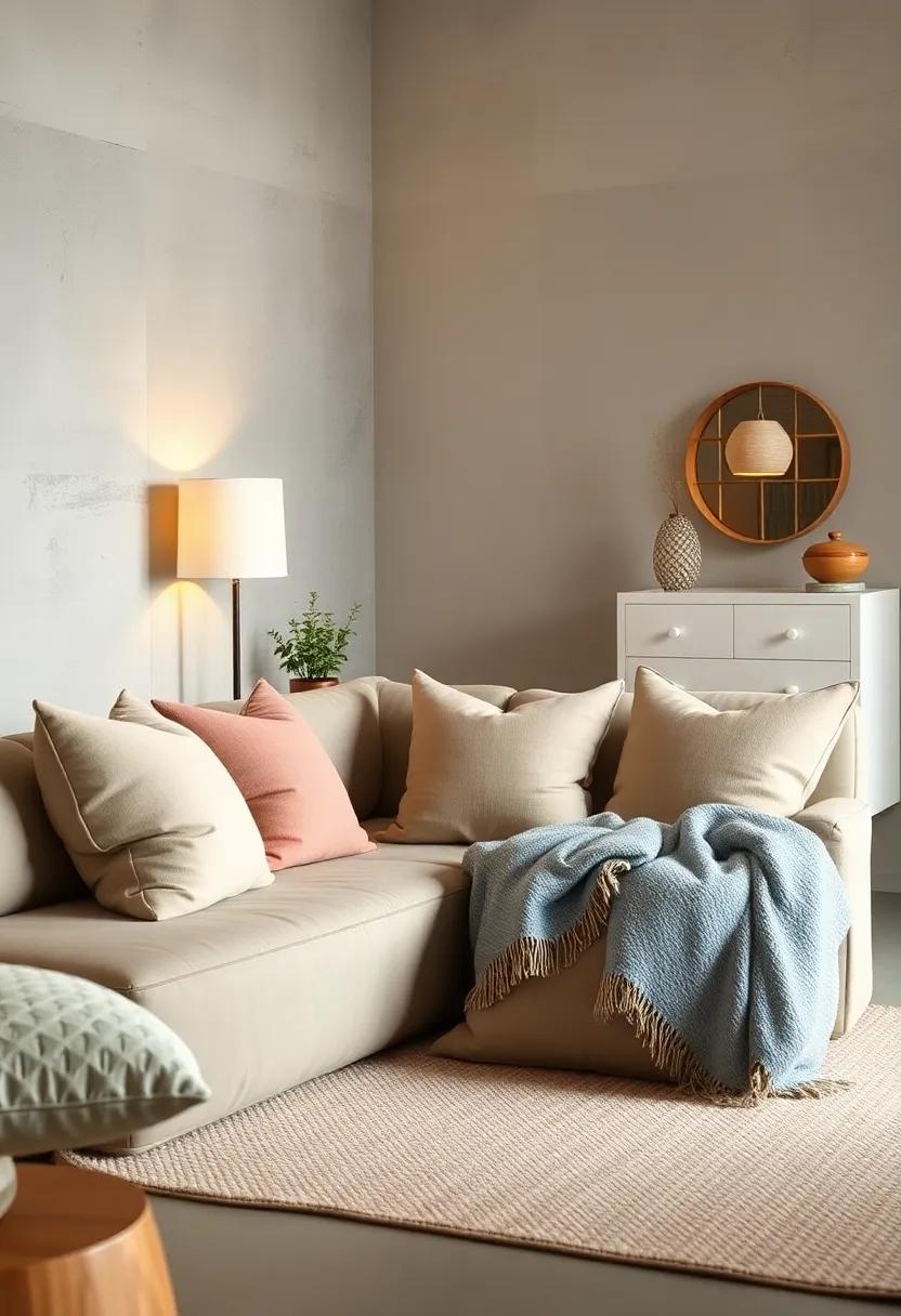 To elevate the warmth of your small living room, consider layering a soft throw blanket over your oversized pillows. This simple addition not only enhances the overall aesthetic but also invites cozy vibes into your space. choose a blanket that contrasts or complements the colors of your pillows to create a visually appealing look. Look for fabrics that invite touch, such as plush fleece, chunky knit, or soft cotton. The key is to drape it casually, allowing the edges to cascade lightly over the sides of the pillows, which adds a touch of effortless style.