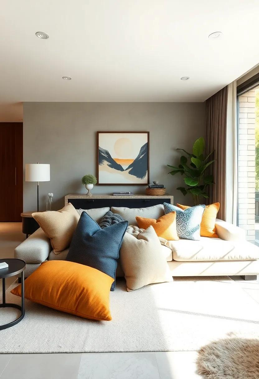 Elevating your small living room’s comfort can be as simple as layering oversized pillows in inviting groups.Opt for a mix of textures—think chunky knits, velvety surfaces, and soft cottons—to add visual interest while maximizing comfort. Consider covering your oversized pillows with seasonal colors or patterns to bring a lively touch to your space. Use varying sizes to create a playful yet stylish look, stacking large, plush pillows behind smaller, accent ones, ensuring an alluring depth that invites lounging and relaxation.