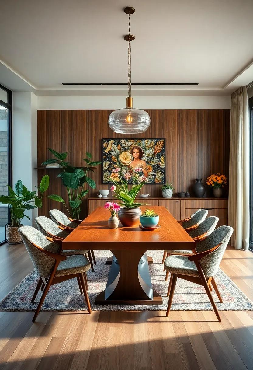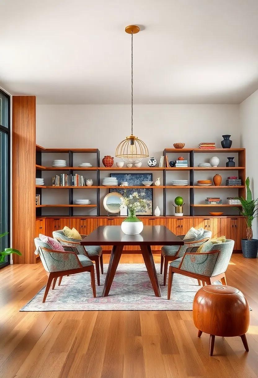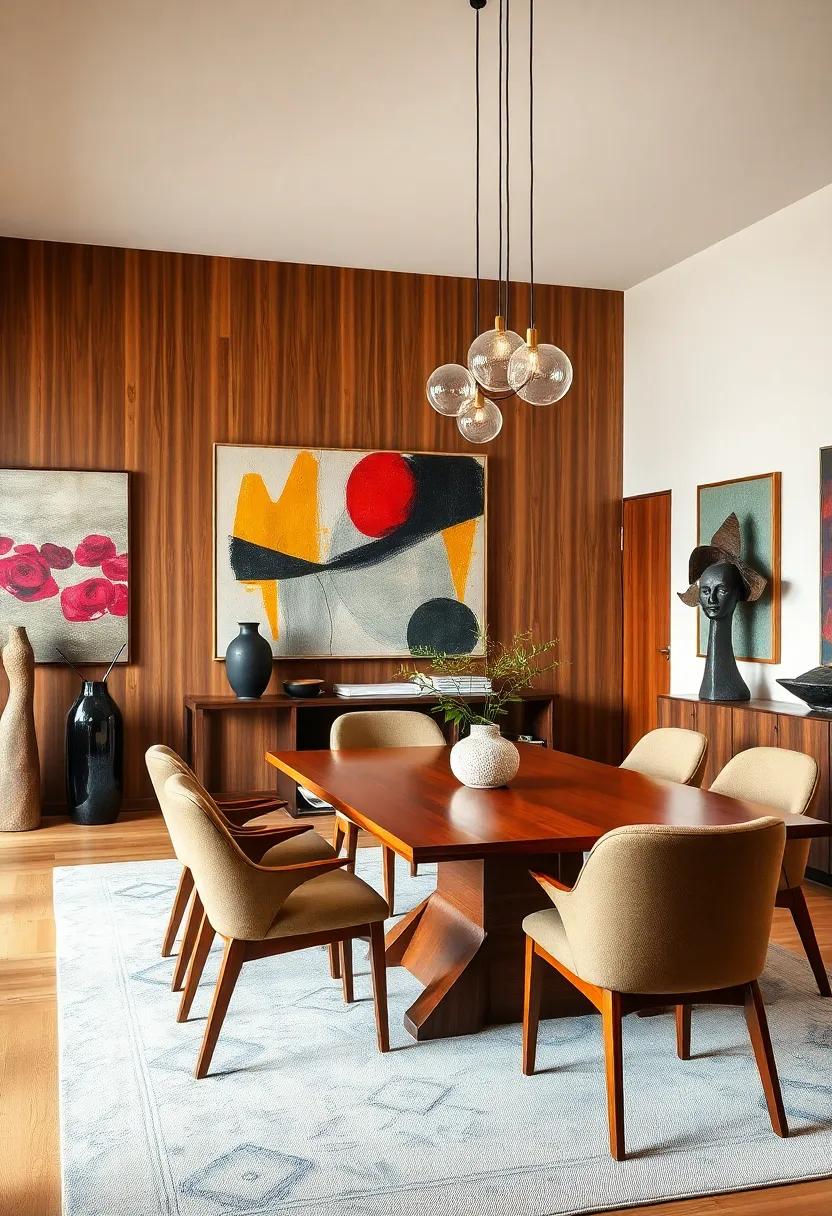 Additionally, showcasing your passion for the arts can give your dining room an inviting vibe. Curate an arrangement of unique art pieces; think abstract sculptures or vibrant paintings that resonate with your aesthetic sensibilities. Don’t shy away from family heirlooms, such as an antique silver candlestick or a striking centerpiece that tells your family’s story.A thoughtfully placed gallery wall combining personal photographs and artwork can create a dynamic display that not only complements the mid-century vibe but also enriches the emotional depth of your dining area.