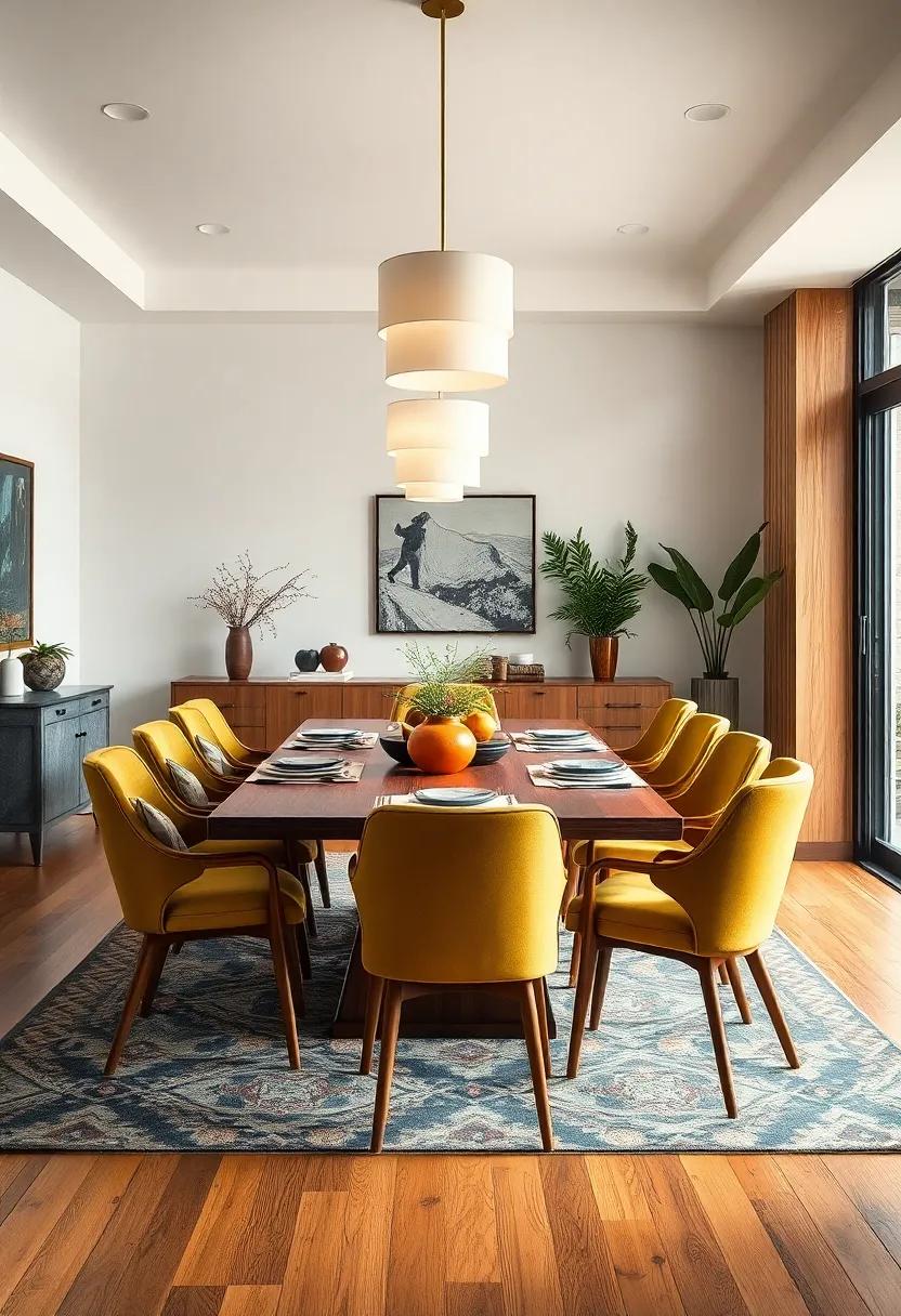 One of the simplest yet most impactful ways to enhance the ambiance of your mid-century modern dining room is by incorporating a bold area rug. These striking floor coverings can act as the visual anchor for your dining table, creating a defined space that draws the eye and adds depth to your design. Consider choosing a rug with geometric patterns or vibrant colors that echo the playful yet sophisticated aesthetic typical of mid-century design. Such elements not only serve a decorative purpose but also add a layer of comfort underfoot, transforming dining into an experience that engages all the senses.