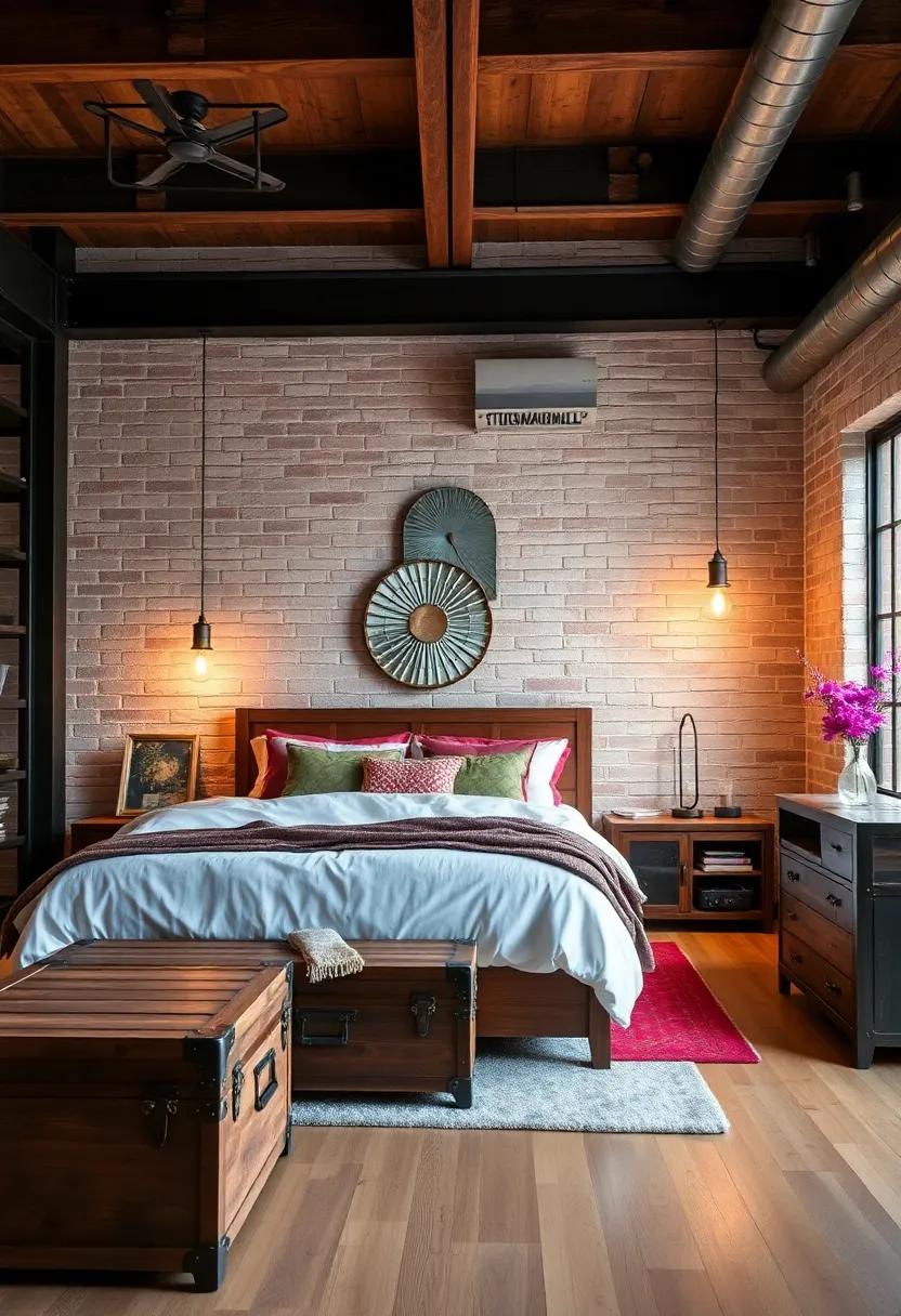 Infusing your industrial bedroom with vintage accents can create a harmonious blend of past and present. Think of incorporating items that carry stories and memories, such as an old trunk. Not only does it serve as a unique storage option, it also adds character and a sense of nostalgia to the space. Consider placing it at the foot of your bed or using it as a coffee table to create an inviting focal point. A distressed dresser can also offer both functionality and style. Its weathered appearance brings warmth to the or else raw elements typical of industrial decor, and it can be a stunning canvas for displaying decorative items or even artwork.