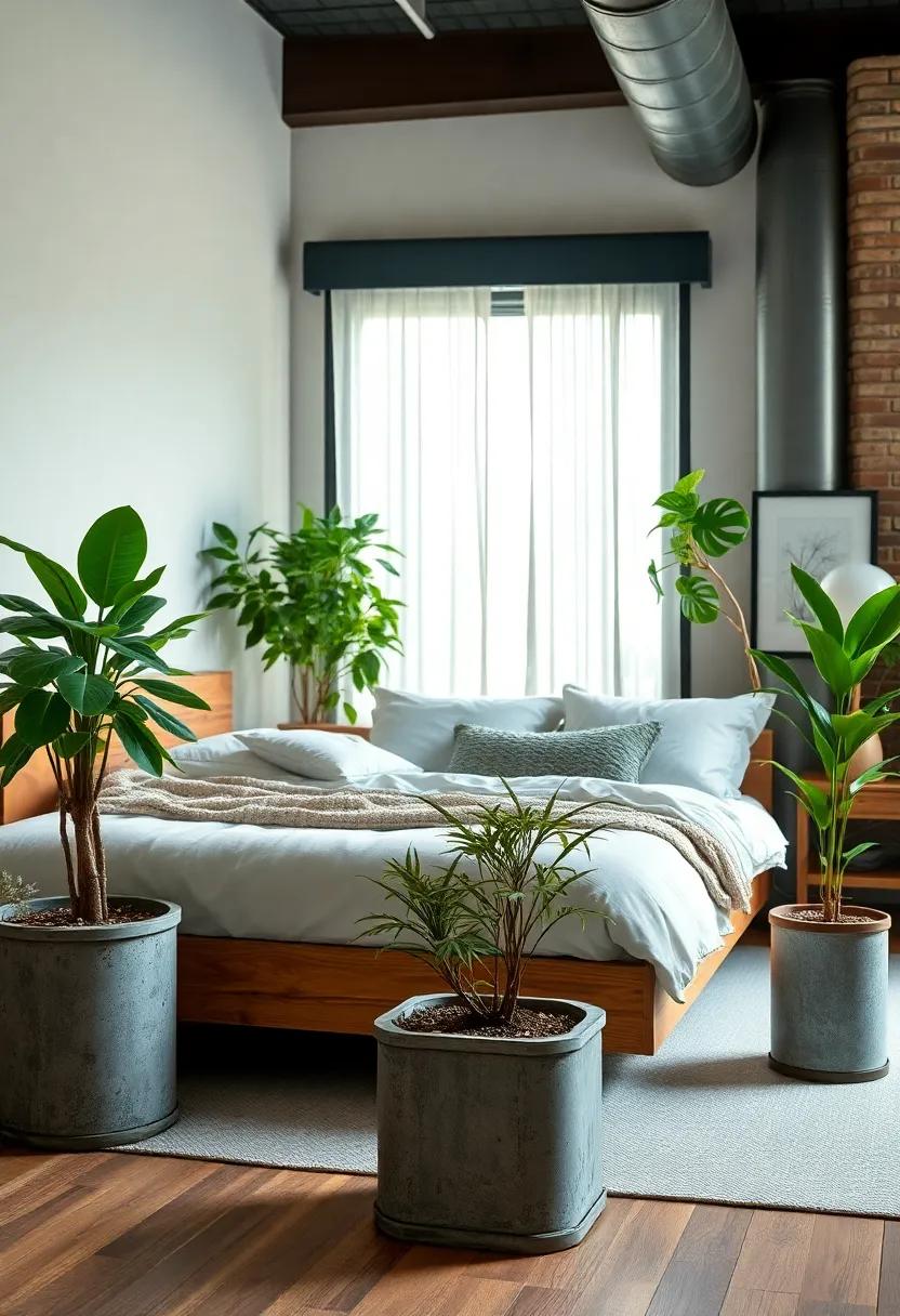 transform the ambiance of your industrial bedroom by introducing a touch of greenery with hardy plants that thrive in urban settings.Choose low-maintainance varieties like snake plants, ZZ plants, or pothos, which not only add vibrancy but also purify the air. Pair these botanical beauties with metal or concrete pots to enhance that rugged aesthetic.The juxtaposition of sleek, modern containers against the organic shapes of plants creates a beautiful balance, making your space feel alive and inviting. Consider arranging a small cluster of pots of varying heights on your bedside table or windowsill to create a mini indoor garden.
