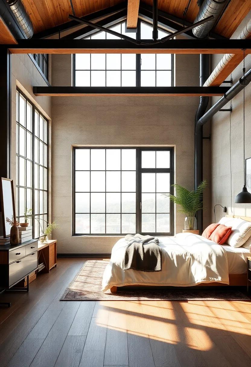 Transforming your industrial bedroom into a sanctuary filled with warmth and vibrancy begins with the inclusion of large windows. These architectural elements not only create an inviting atmosphere but also serve as a dramatic feature, drawing the eye and allowing the outside world to seep in. Consider the following styles to elevate your space: