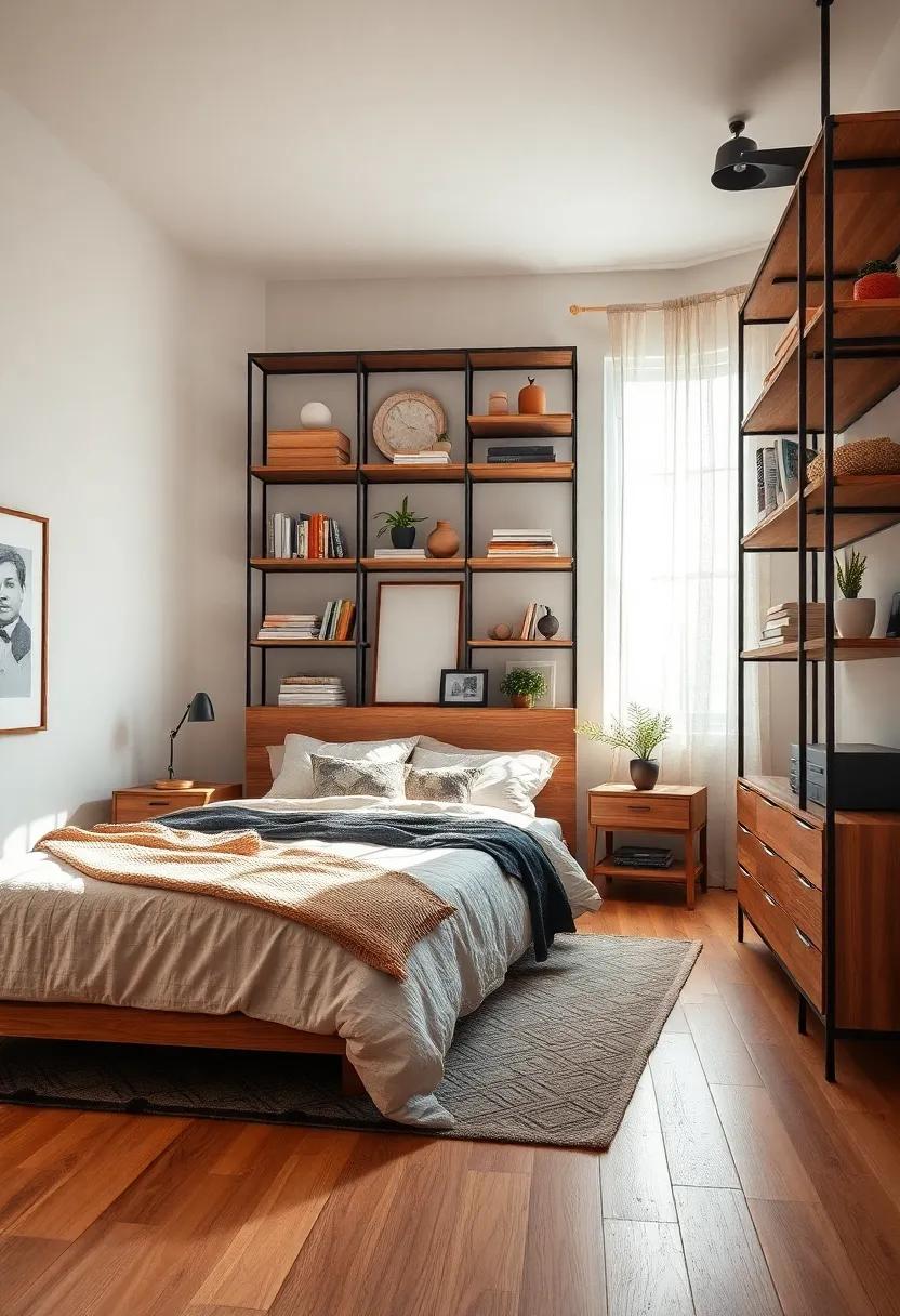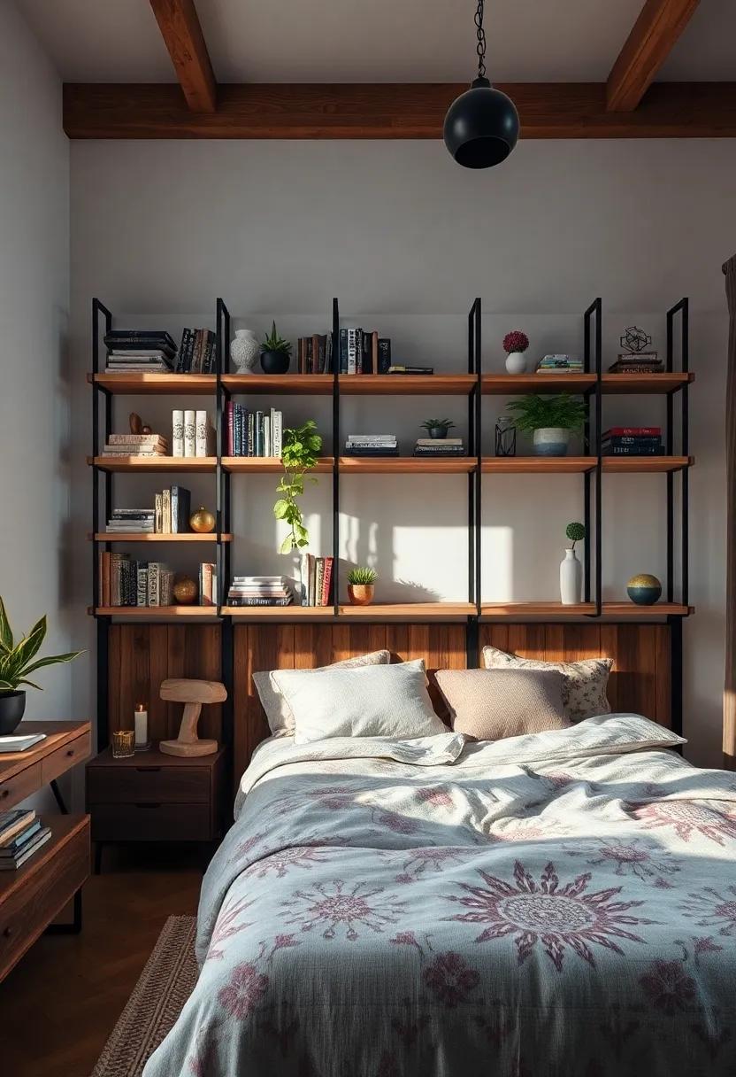 For a cohesive look, mix and match textures while ensuring that each item serves a purpose or adds visual interest. A well-organized open shelf can breathe new life into your space, making it not only more functional but also an intriguing focal point in your industrial bedroom.