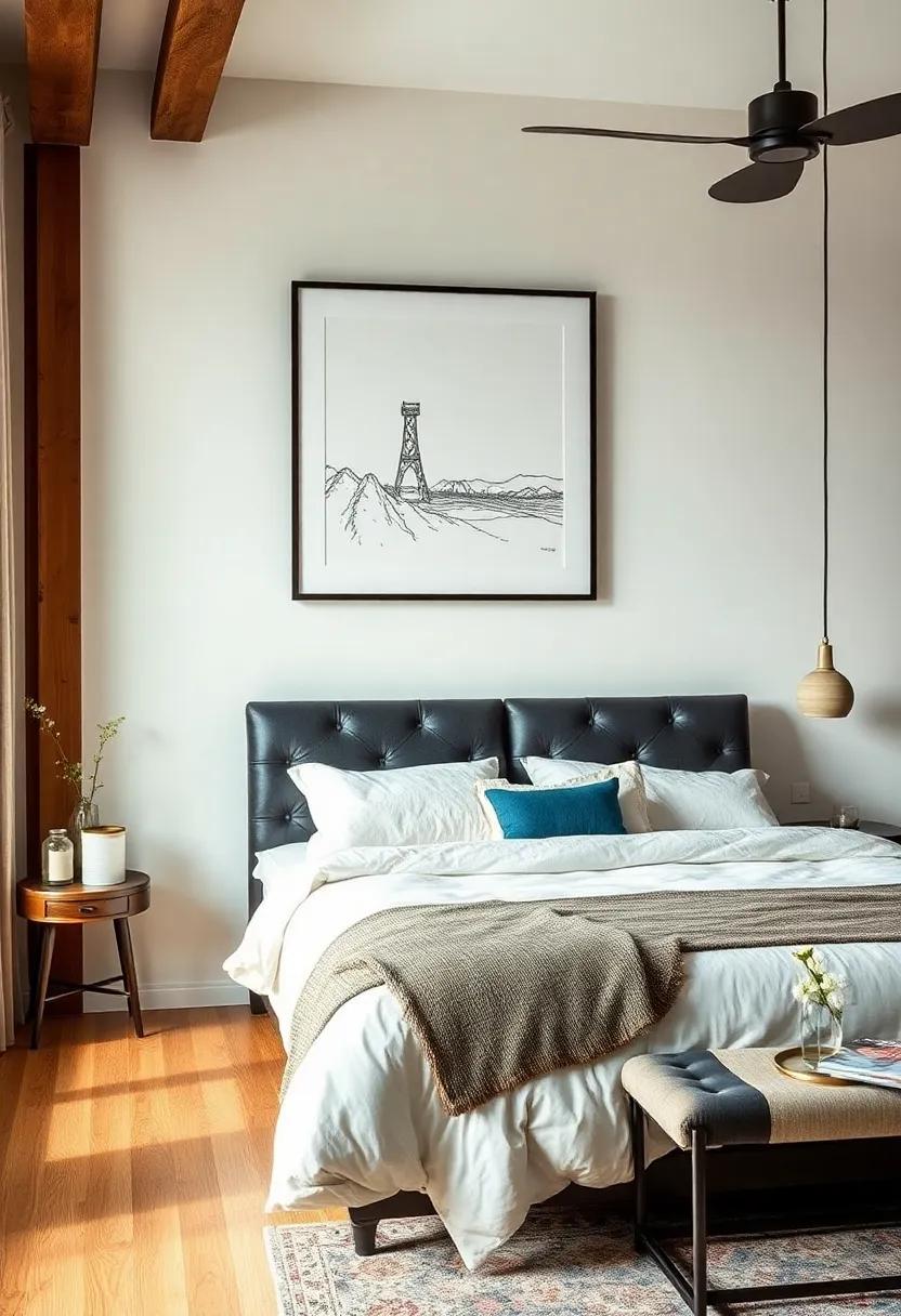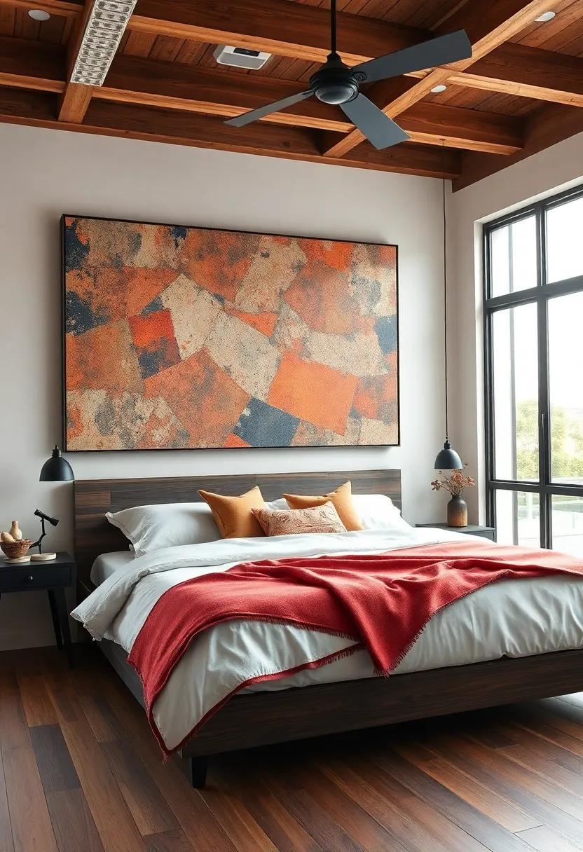 Transform your bedroom into a striking visual narrative by incorporating large-scale industrial artwork or abstract pieces that command attention while maintaining an airy atmosphere. Think oversized canvases featuring bold strokes or gritty textures that echo the raw beauty of industrial materials. These artistic expressions can serve as focal points, drawing the eye and sparking conversation without detracting from the rest of your decor. To effectively integrate these pieces, consider: