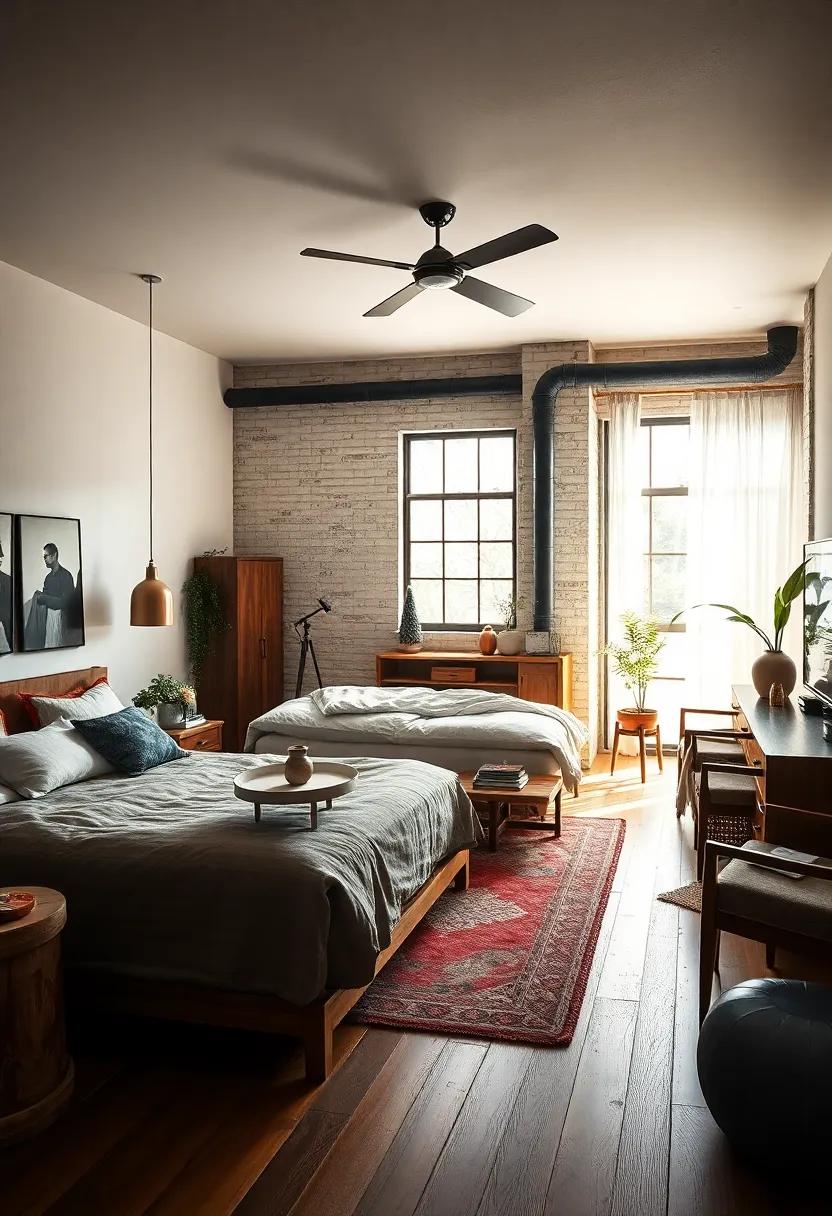 To further elevate your space, consider large metal pendant lights that draw the eye upwards and add character. These fixtures, often crafted from materials like iron or aged brass, can bring a touch of rugged elegance that complements the industrial theme. Hang them above a statement piece, like a reclaimed wood bed frame or a vintage-style dresser, to create a cohesive look. With their varying shapes and sizes, these pendant lights allow for creativity in layering light sources, ensuring your industrial bedroom remains well-lit and visually dynamic.