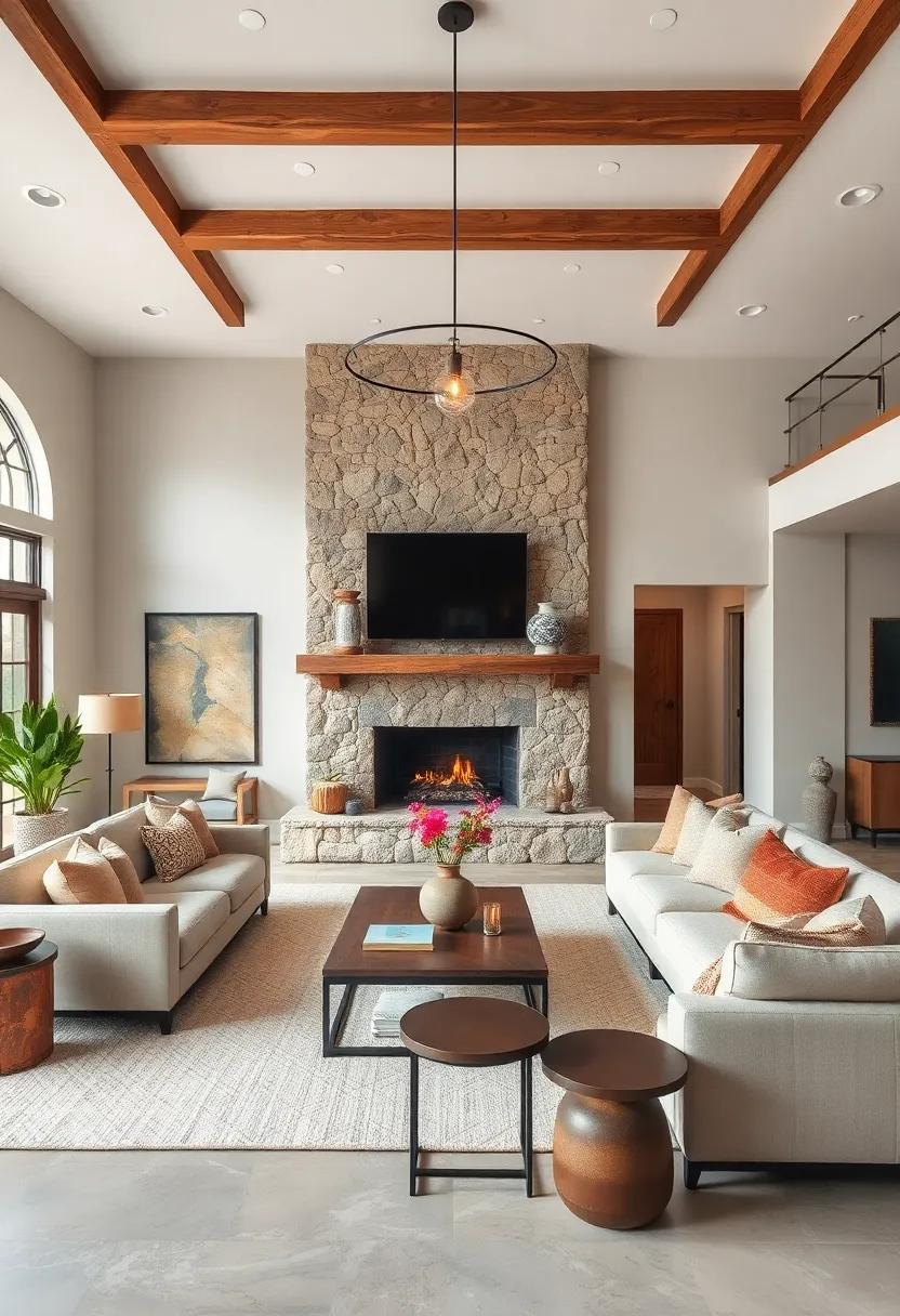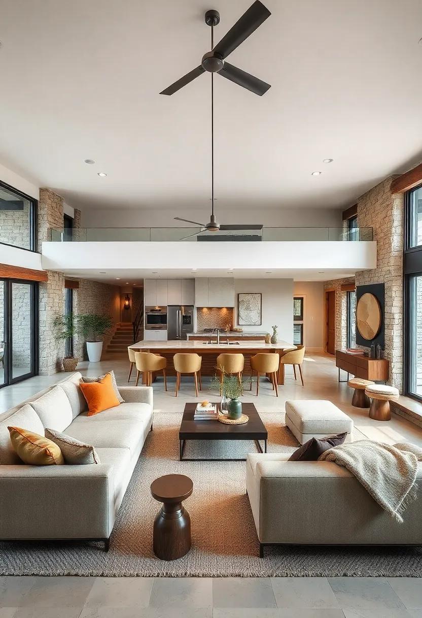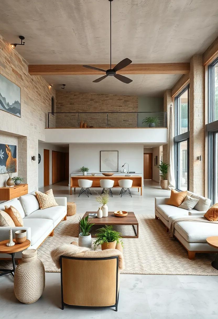 Embrace Natural Materials: Use reclaimed wood and stone accents to bring a warm, organic feel to your open concept living room