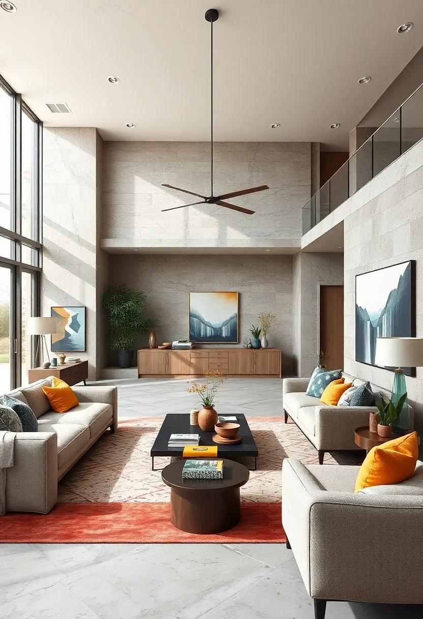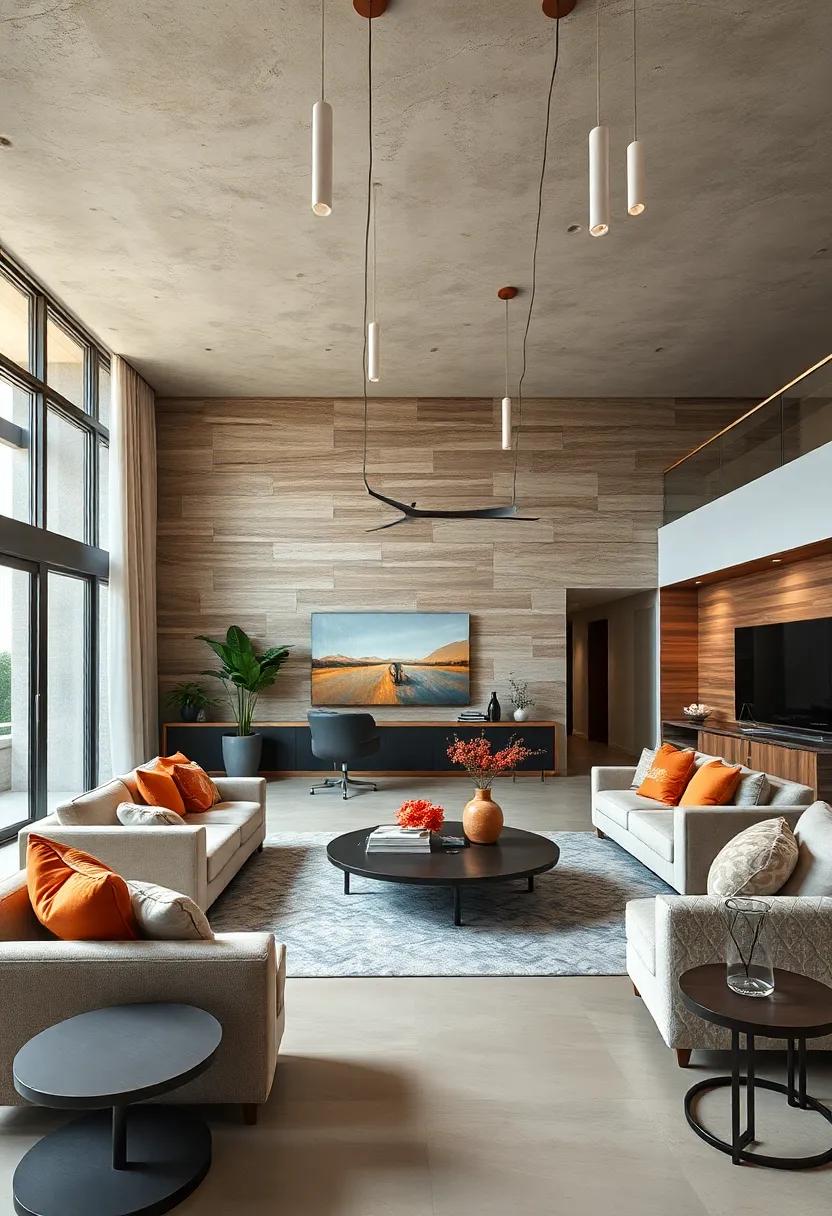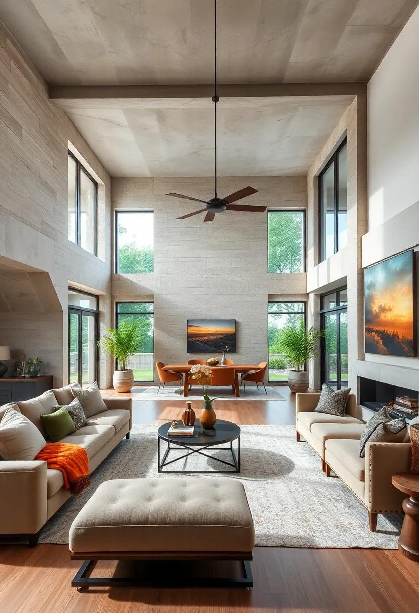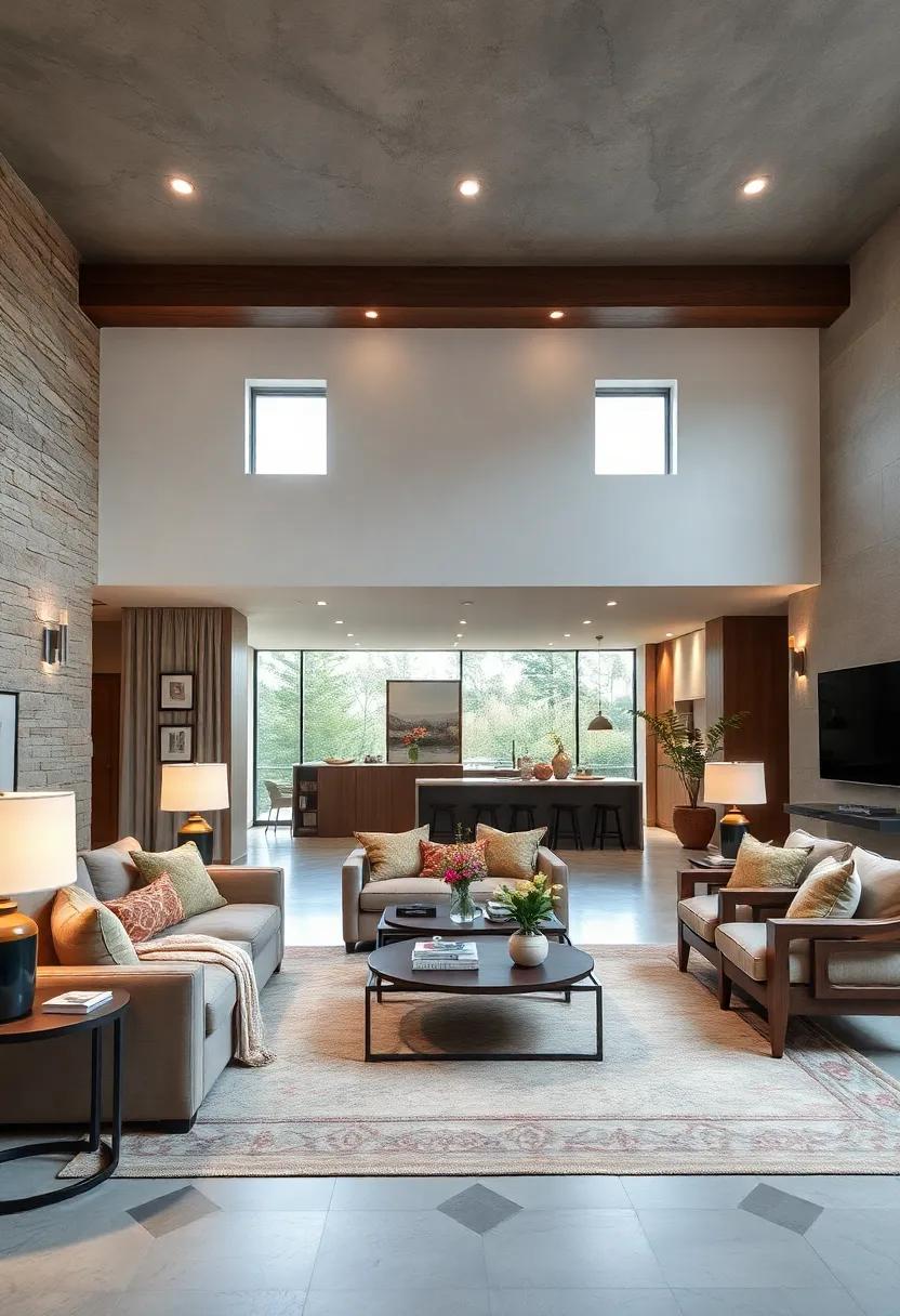 Embrace Natural Materials: Use reclaimed wood and stone accents to bring a warm, organic feel to your open concept living room