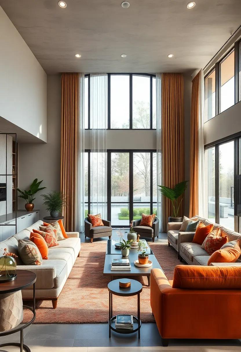 Embodying the essence of the outdoors, a palette rich in browns, burnt oranges, and muted greens transforms an open-concept living room into a tranquil haven. Choose deep chocolate browns for larger furniture pieces or accent walls, as they create a warm, inviting foundation. Pair these with burnt orange accents—think throw pillows, vases, or artwork—that evoke the glow of a sunset, adding a splash of vibrancy to the earthy scheme. To round it off, integrate muted greens thru houseplants or light curtains that mimic the calming hue of nature, seamlessly connecting the indoors with the outside world.