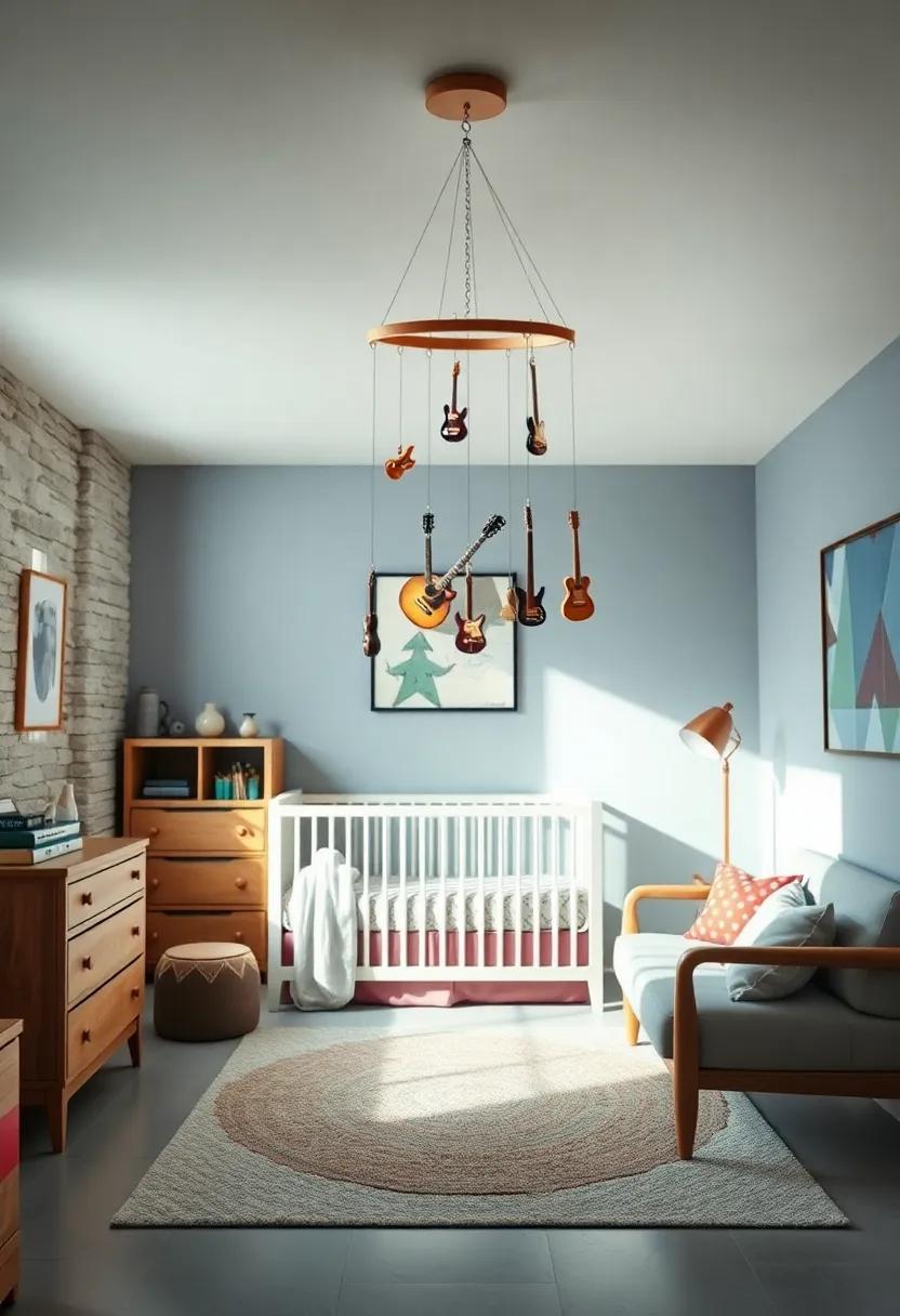 Instrumental Mobile: Hang a mobile featuring miniature musical instruments like guitars,drums,and trumpets to spark curiosity and imagination