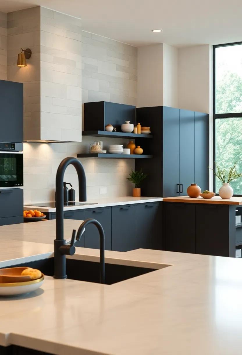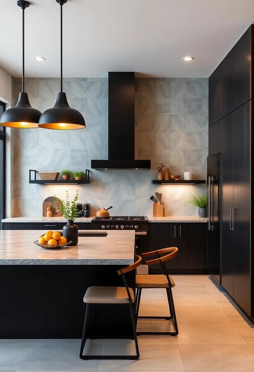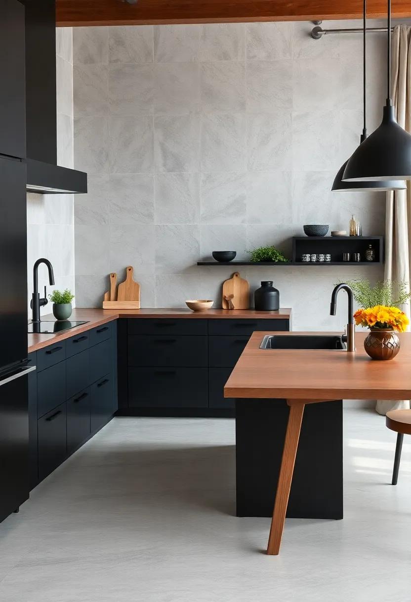 - Geometric Tiles: Choose hexagonal or chevron-patterned tiles in vibrant colors to juxtapose against matte black cabinetry.