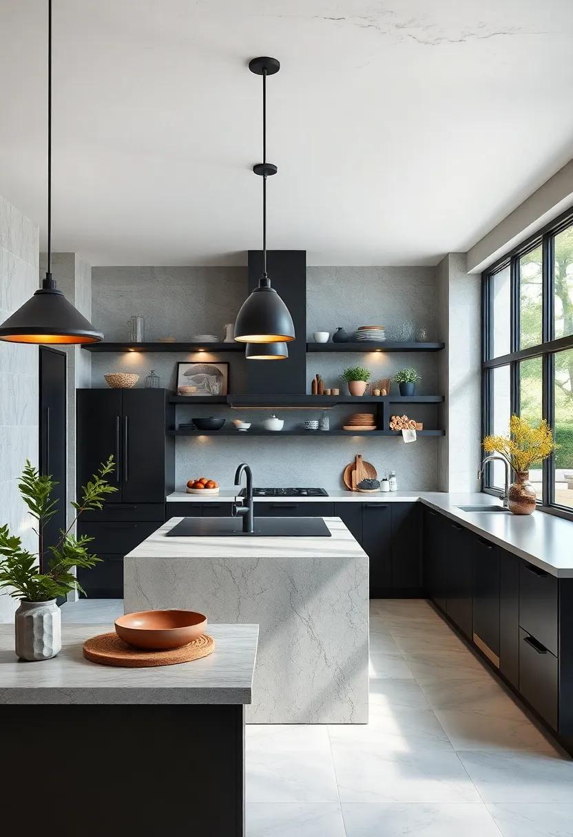 Matte black frames for windows and open shelving introduce a striking visual contrast that draws the eye and enhances the overall elegance of your kitchen. These frames not only serve a practical purpose but also act as stylish borders that elevate the sophistication of the space. When paired with natural light streaming through expansive windows, the matte black finish creates a stunning collaboration with sunlight, producing a warm and inviting ambiance. Utilizing this bold yet refined color ensures that your kitchen becomes a statement of modern design, where every culinary creation feels like a work of art.