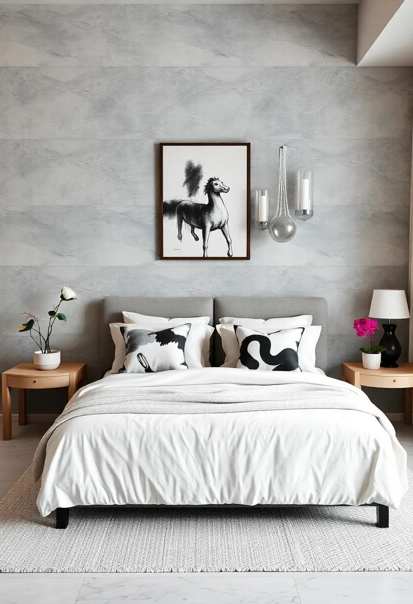 - Wall Art: Add monochrome artwork above the bed to tie the room’s theme together.