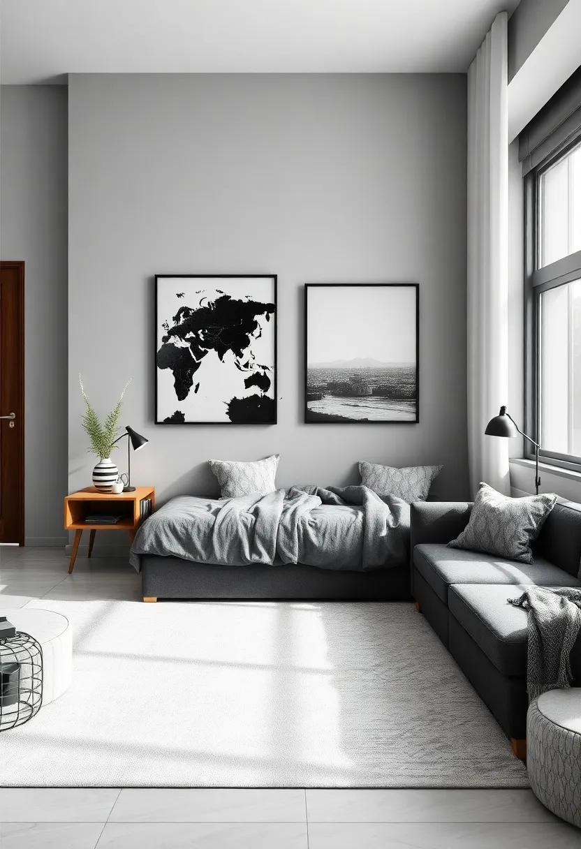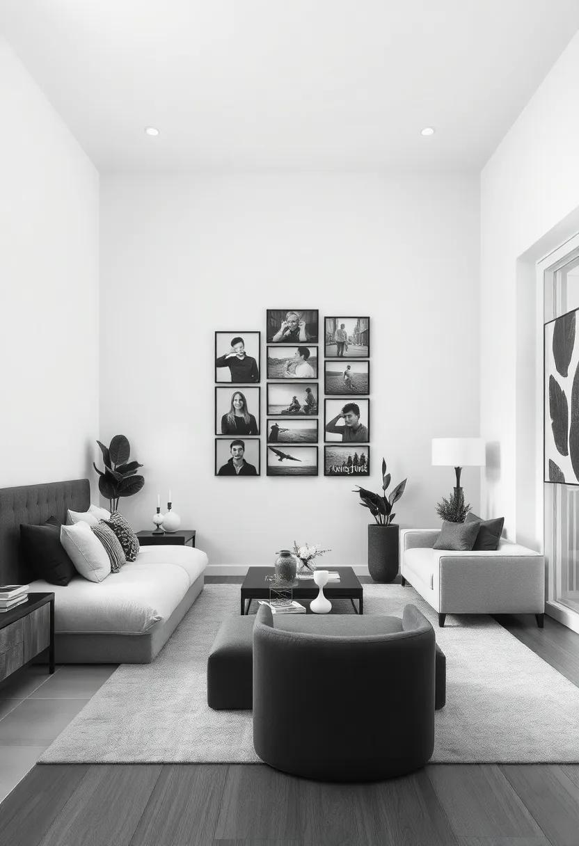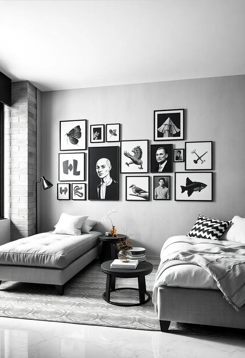 Transform a plain wall into a striking visual experience with a meticulously curated gallery wall that showcases a spectrum of black-and-white art pieces, photographs, and posters. Start by selecting a color palette that resonates with the overall theme of the room, ensuring each piece complements rather than competes with the others. mix various styles—from classic portraits to modern abstract designs—to create an engaging arrangement. Consider using simple frames in solid black or white to maintain consistency while allowing the art to shine.