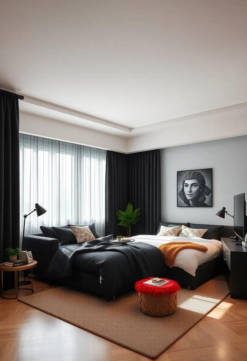 Embrace the beauty of nature indoors by incorporating low-maintenance plants in sleek matte black pots that pop against a monochrome decor. Succulents, snake plants, and pothos offer vibrant greens without demanding too much attention, allowing you to focus on your space. Arrange a cluster of these plants on a sleek black bookshelf or a bedside table, creating an eye-catching focal point that breathes life into your room while maintaining a clean aesthetic. The verdant hues not only enhance the ambiance but also contribute to a positive, refreshing atmosphere.
