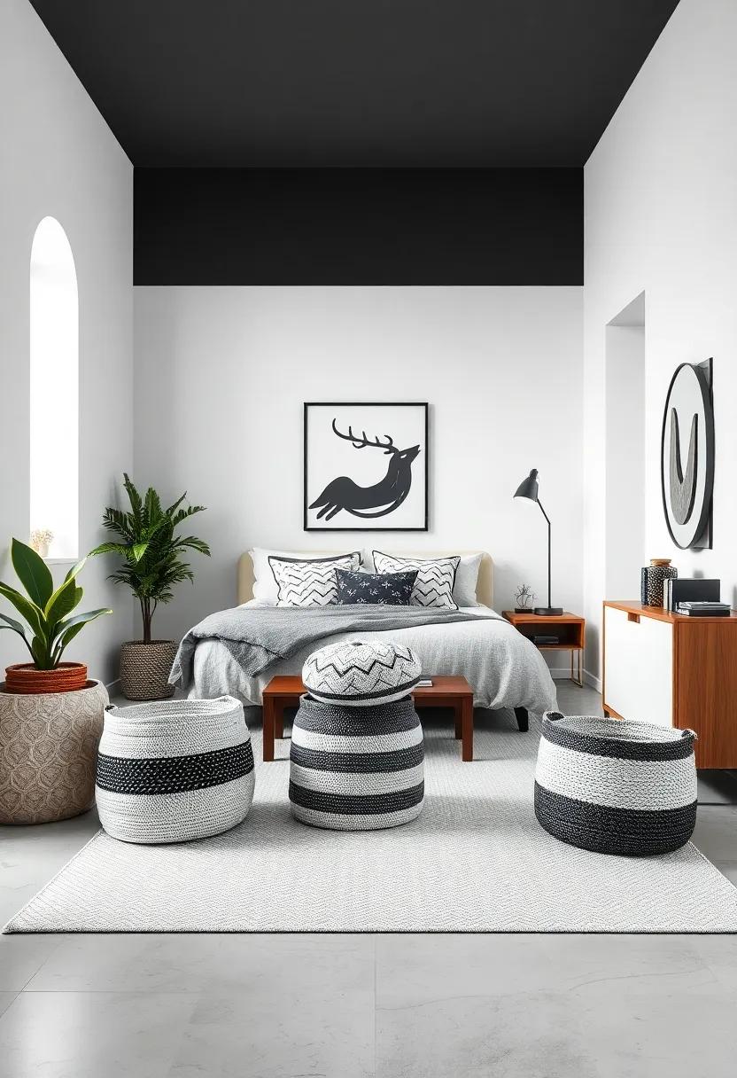 Decorative Storage Bins: Use stylish monochrome woven or fabric bins to keep the space organized while enhancing the overall aesthetic