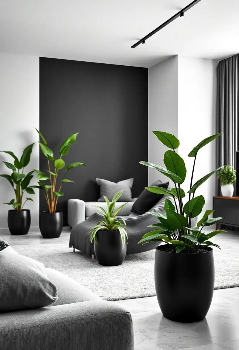 Fresh Greenery with Black Pots: Bring life to the space with low-maintenance plants in matte black pots, creating a stunning contrast against the monochrome backdrop