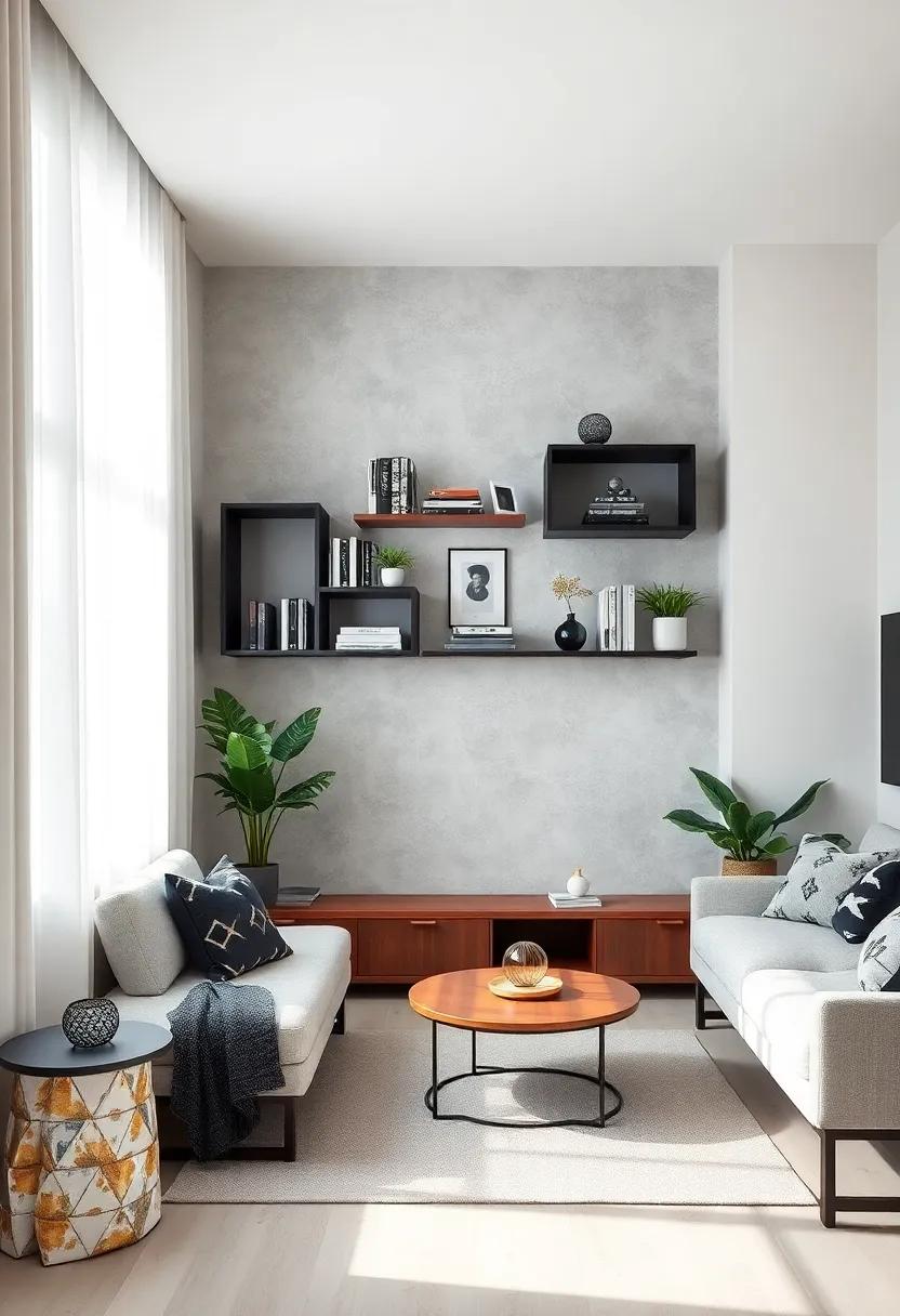 Geometric Wall Shelves: Install geometric wall shelves painted in black or white to display books, decor, or plants, adding dimension to the room
