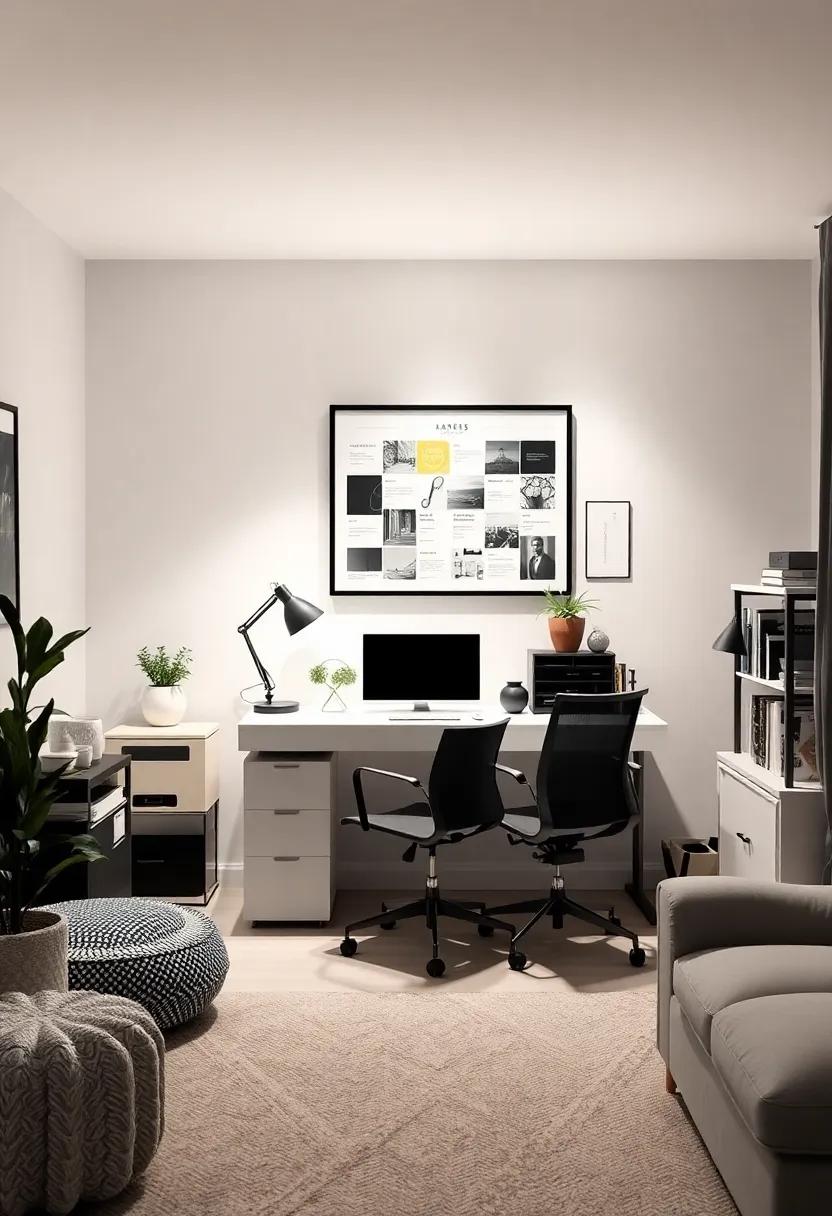 Complement your bins with a bold wall calendar or minimalist art pieces to tie everything together, giving the room a cohesive look that resonates with contemporary style. With these storage solutions, you not only create a workspace but also a sanctuary that reflects personal taste while maintaining order.