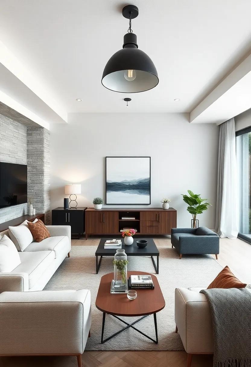 Statement Light Fixtures: Choose an industrial-style black pendant light or a minimalist table lamp that adds a bold touch without overpowering the room