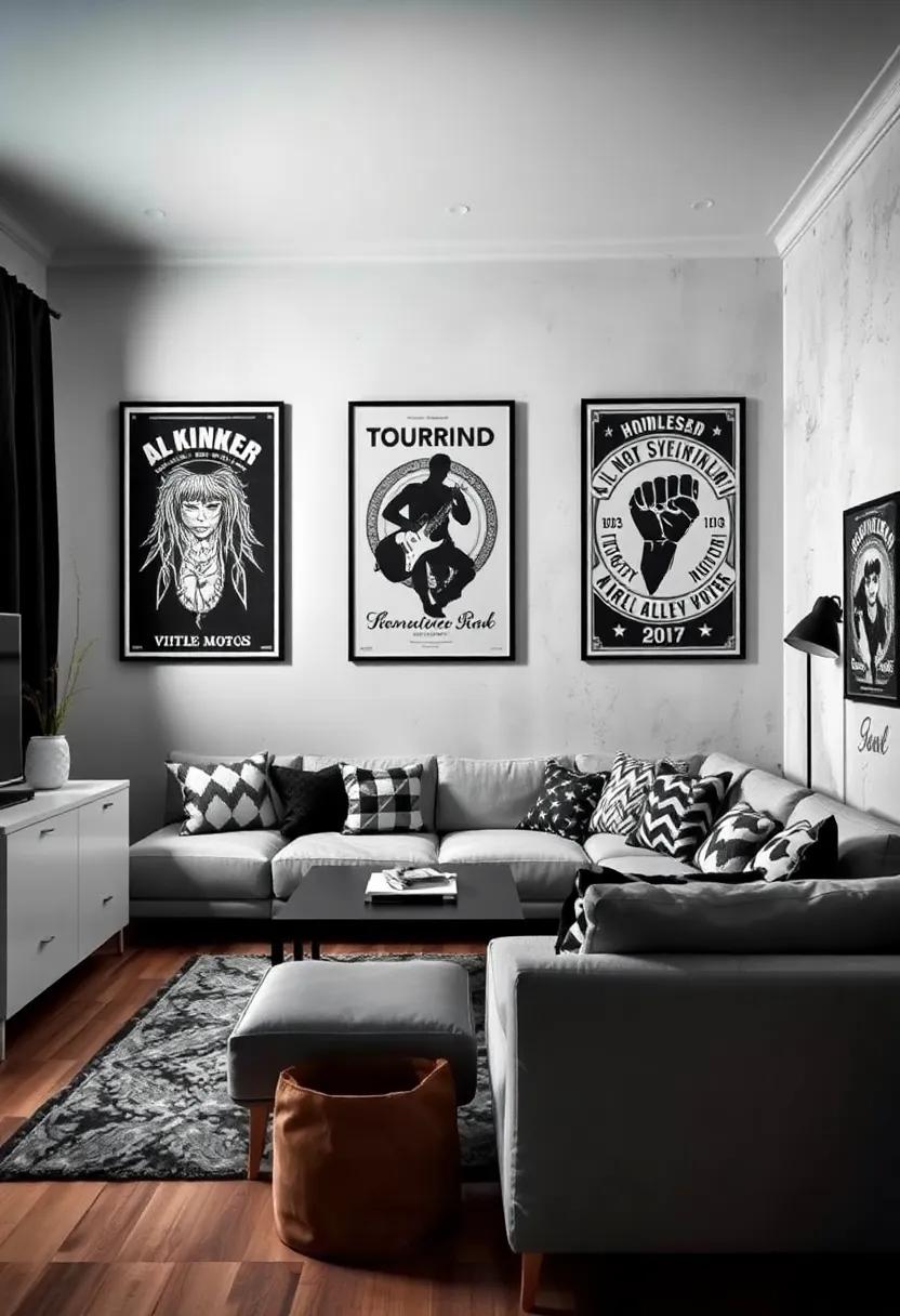 vintage-Inspired Rock Posters: Hang vintage rock posters with bold black-and-white designs to add a musical touch while adhering to the decor theme