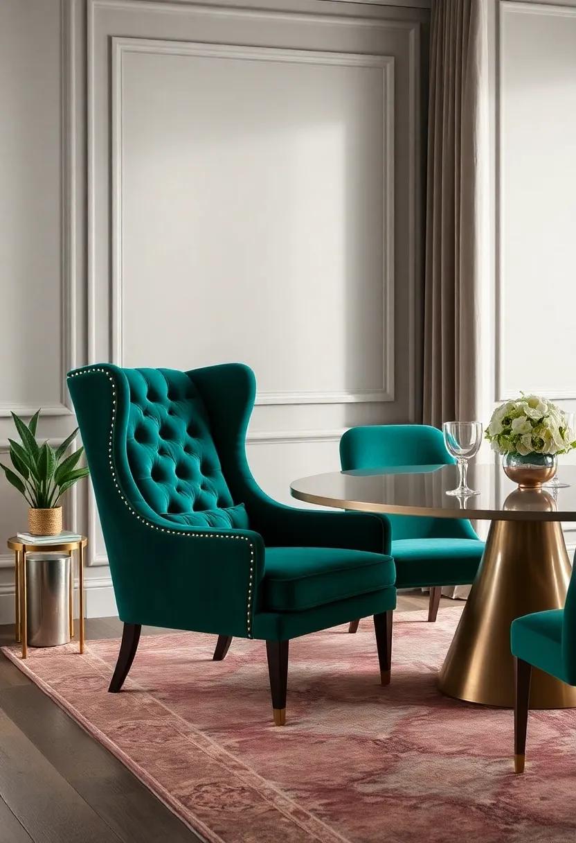 The Regal Recline: This deep emerald velvet chair with a plush backrest adds a royal touch, perfect for sophisticated dinner parties