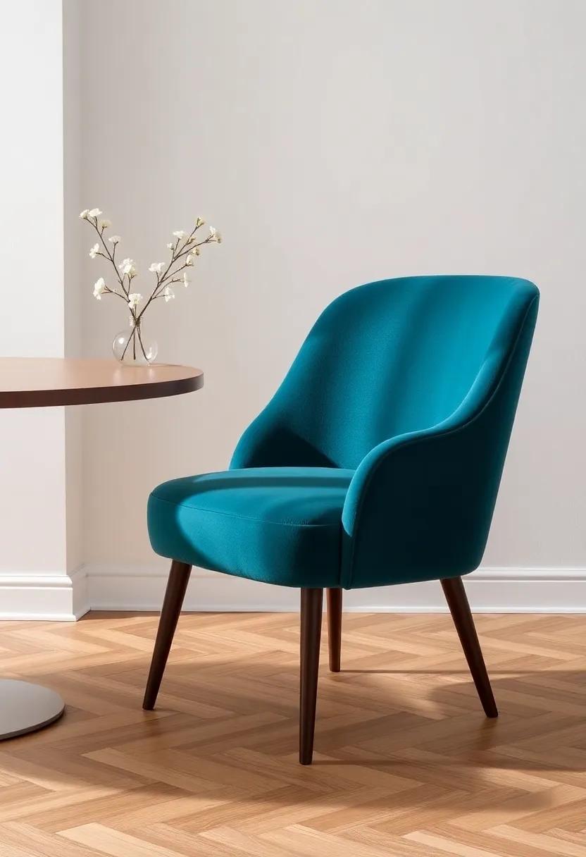 Chic and Charismatic: The unique curved silhouette of this teal velvet chair draws the eye, making it a fantastic focal point for any dining room