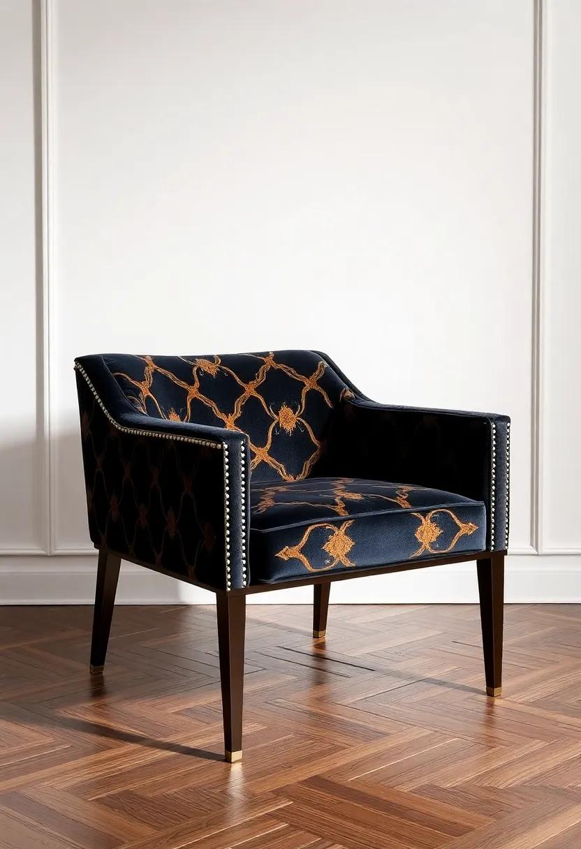 Art Deco Delight: Inspired by Art Deco aesthetics, this chair features geometric patterns upholstered in luxurious black and gold velvet