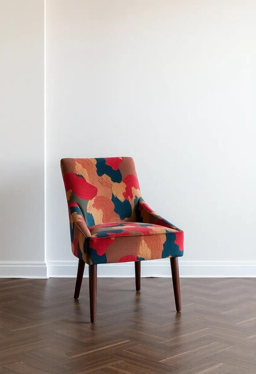 Abstract Allure: Featuring an abstract pattern in rich hues on plush velvet, this chair introduces artful elegance into the dining space