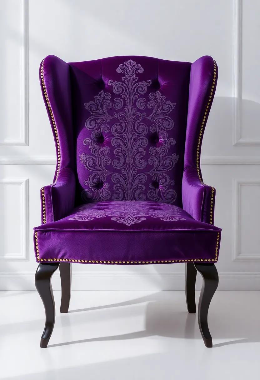 Imagine a dining room where every meal feels like an occasion, illuminated by the regal presence of a chair upholstered in sumptuous deep purple velvet. This piece not only exudes opulence but also serves as a stunning centerpiece that invites attention and admiration. Enhanced by intricate embroidery, each stitch tells a story of artistry and craftsmanship, creating a tapestry of color and texture that elevates the overall aesthetic. The vibrant hue of the velvet, rich and inviting, complements a variety of dining room styles, from contemporary chic to classic elegance.