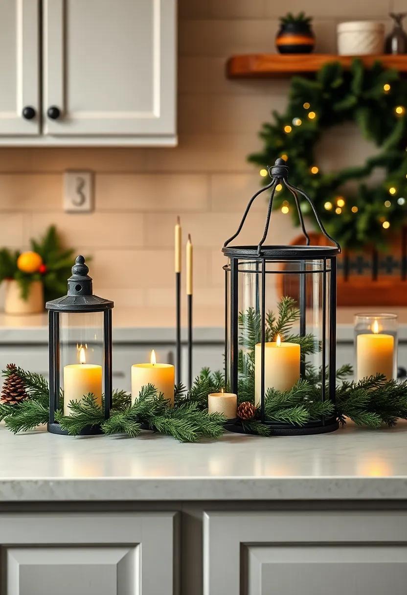 Rustic Lanterns with Candles: Place lanterns filled with candles and evergreen sprigs on countertops for a warm glow that embodies holiday spirit