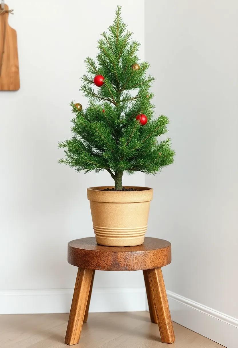 Sapling Christmas tree on a Stool: Use a small,potted spruce as a living tree,sitting it on a rustic stool for an eco-friendly Christmas touch