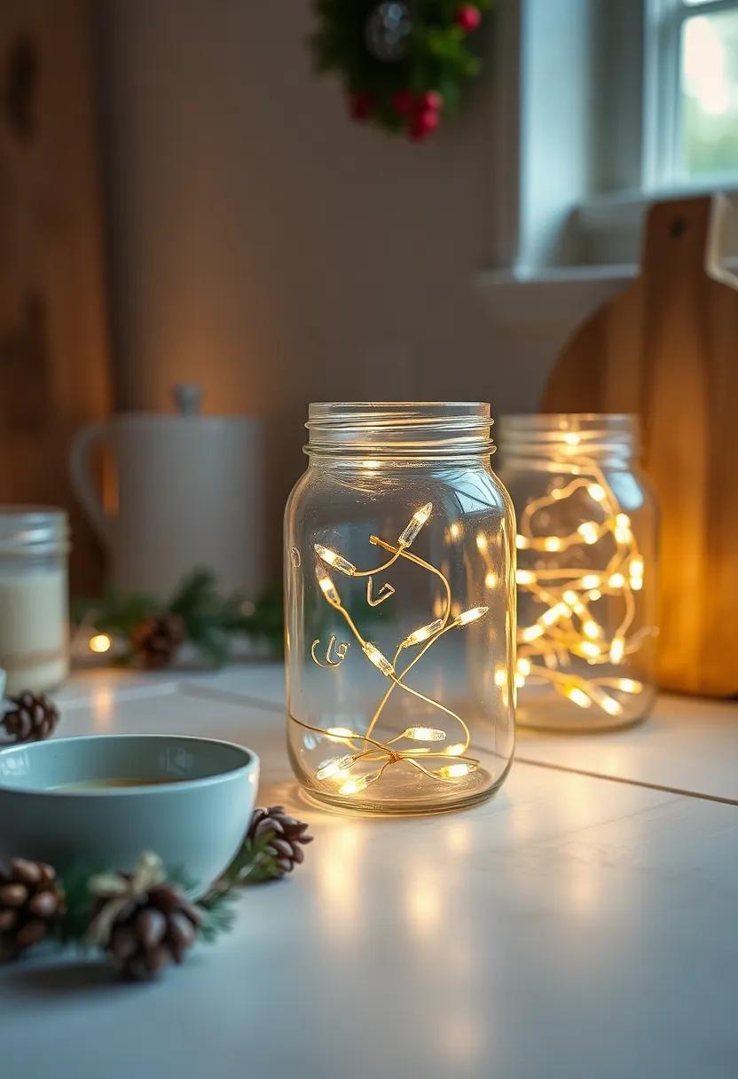 Twinkling Fairy Lights in Jars: fill large jars with fairy lights for a magical touch, illuminating your kitchen with holiday warmth