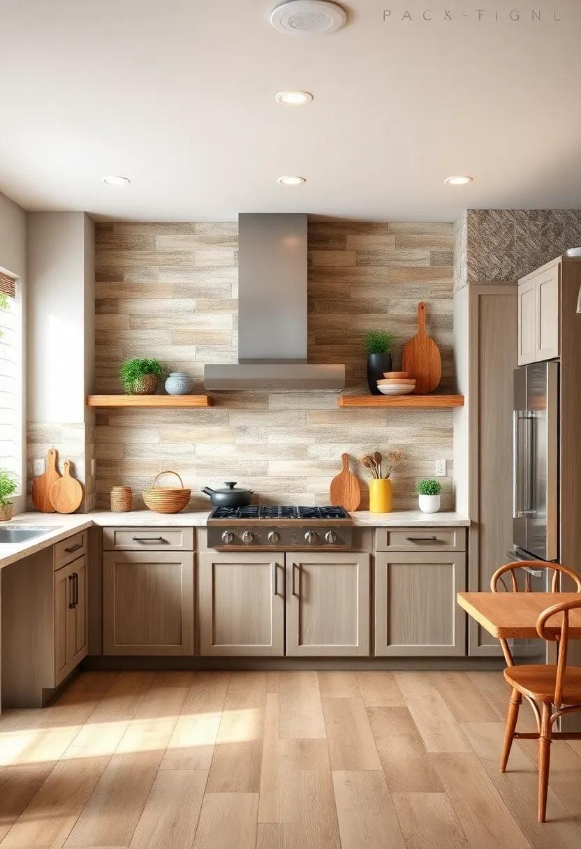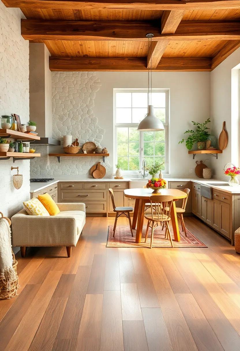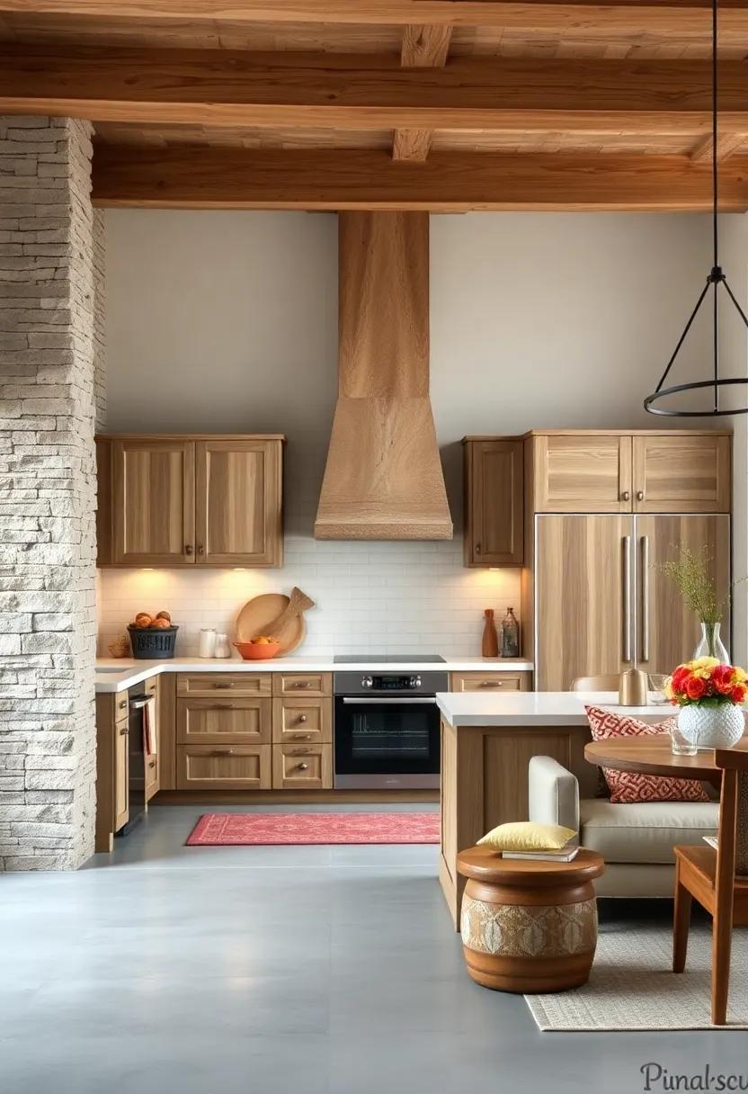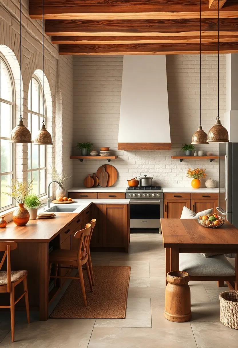 Consider using a palette of complementary colors to harmonize the rich textures of wood. Soft whites, earthy greens, and warm neutrals can accentuate the natural beauty of wooden elements without overpowering them. To further enhance the rustic vibe, incorporate handmade ceramic dishware or woven baskets filled with seasonal produce. You might also integrate the beauty of wood into your kitchen island or countertops, creating a centerpiece that draws the eye and invites guests to gather around. Here’s a simple overview of ways to incorporate wood: