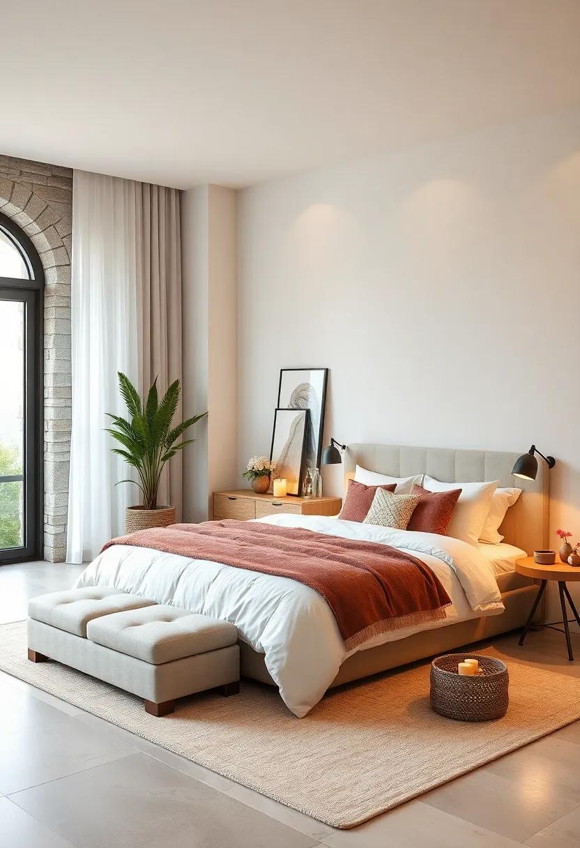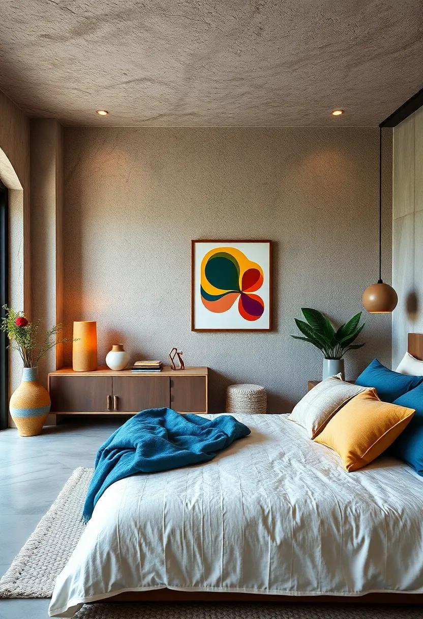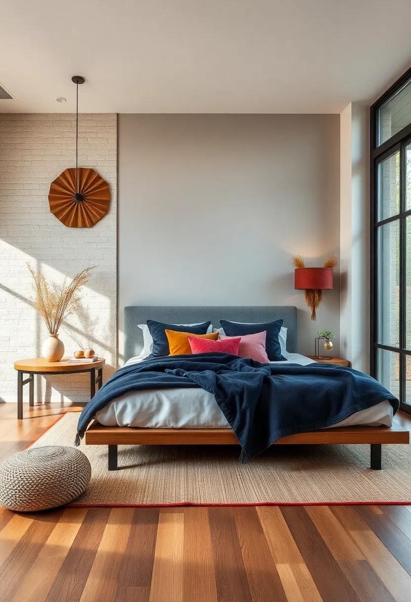 In addition to larger items, small decorative accents can have a significant impact. Think about integrating colorful throw pillows with geometric patterns or even a bright throw blanket draped over the foot of the bed. You could also opt for colorful candles in varied heights, artfully arranged on a tray to add both scent and aesthetic appeal. To elevate the experience, consider a table arrangement that pairs vibrant flowers with structured greenery, ensuring your serene retreat has just the right burst of energy without overwhelming the senses.