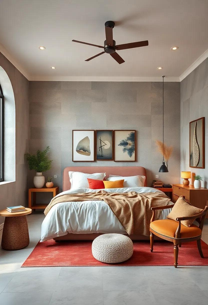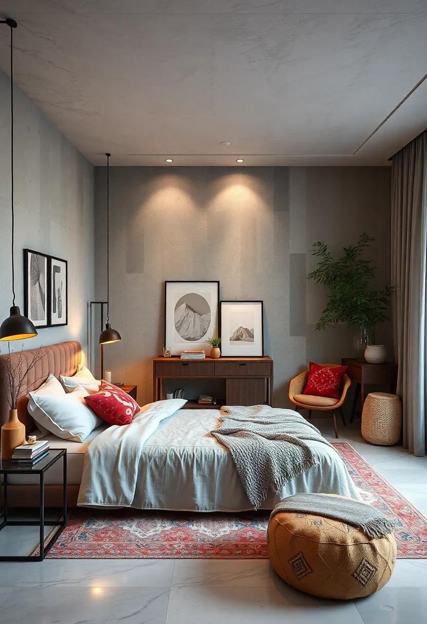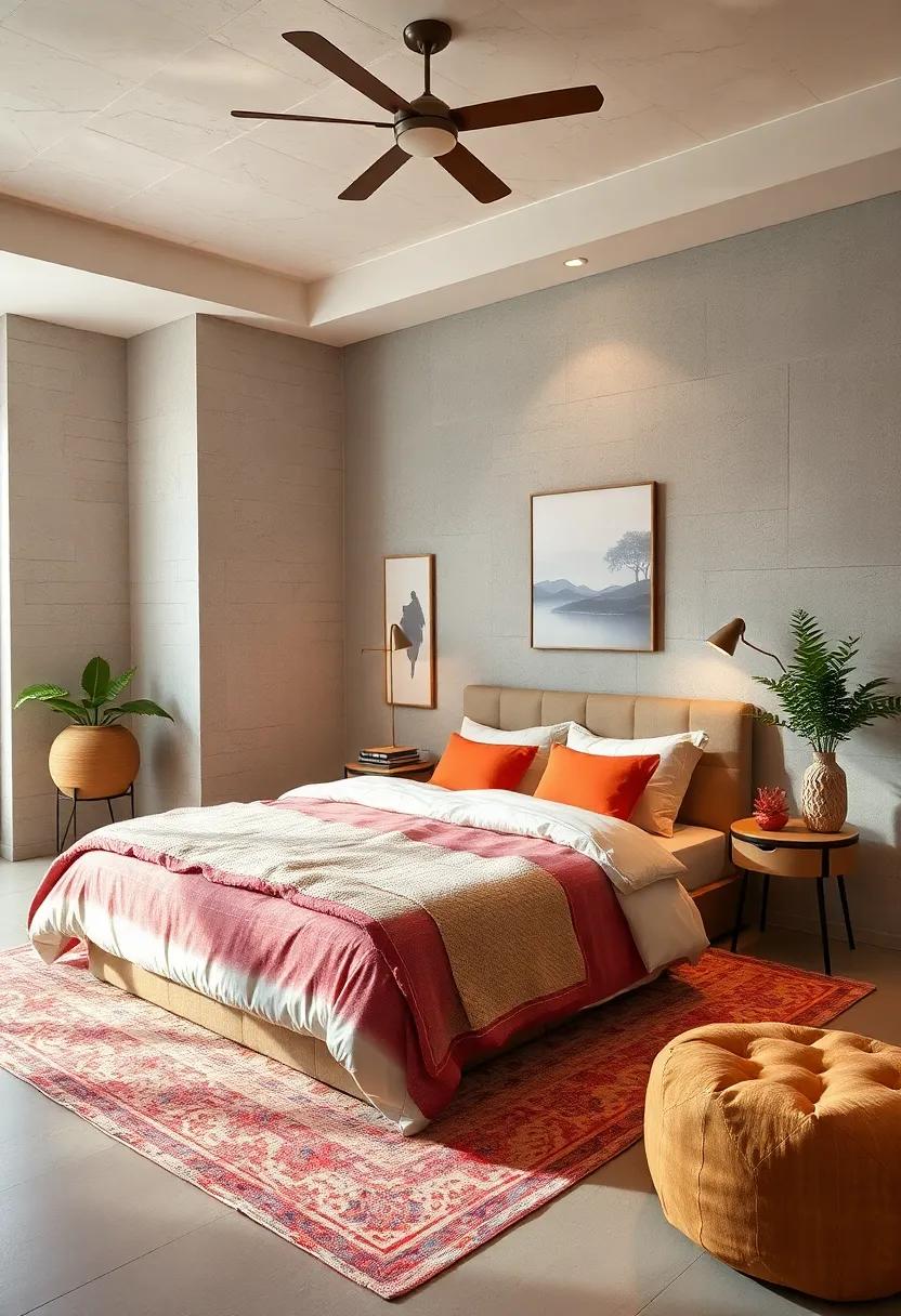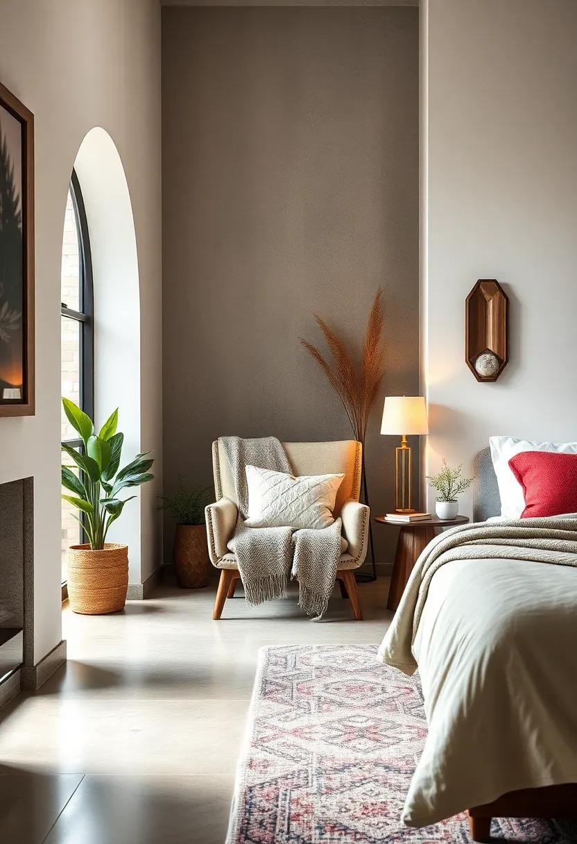 In addition to larger items, small decorative accents can have a significant impact. Think about integrating colorful throw pillows with geometric patterns or even a bright throw blanket draped over the foot of the bed. You could also opt for colorful candles in varied heights, artfully arranged on a tray to add both scent and aesthetic appeal. To elevate the experience, consider a table arrangement that pairs vibrant flowers with structured greenery, ensuring your serene retreat has just the right burst of energy without overwhelming the senses.