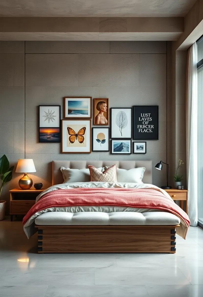 For an added touch, you may choose to incorporate a small table or shelf beneath the gallery to display themed decor items or plants. Each curated piece will transform your bedroom wall into an expression of who you are, cultivating a serene atmosphere conducive to relaxation and creativity.