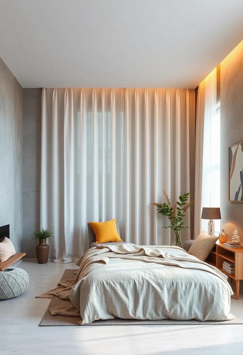 Introducing soft, sheer curtains to your bedroom can dramatically transform the ambiance of your space. These lightweight drapes filter natural light, creating a gentle glow that enhances the serene atmosphere you’re striving for. The ethereal quality of sheer fabrics adds an element of elegance while maintaining a minimalist vibe. Hang them from ceiling to floor for a seamless look, allowing the light to cascade in freely and brighten your mornings.